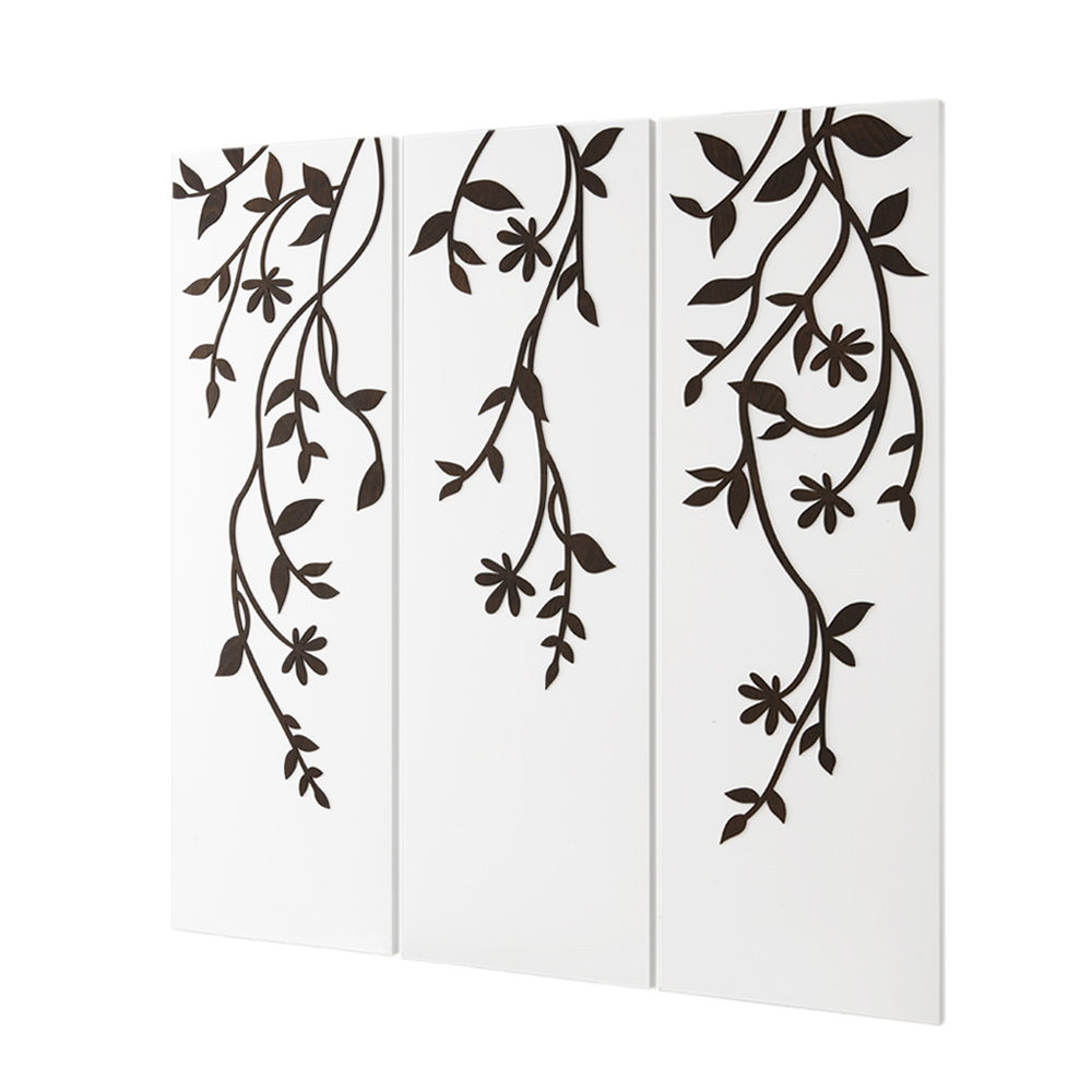 Komposition aus 3 Paneelen zum Einzelaufhängen aus mattweiß lackiertem Holz mit Wengeholzapplikation , die Zweige mit von oben fallenden Blättern darstellt.