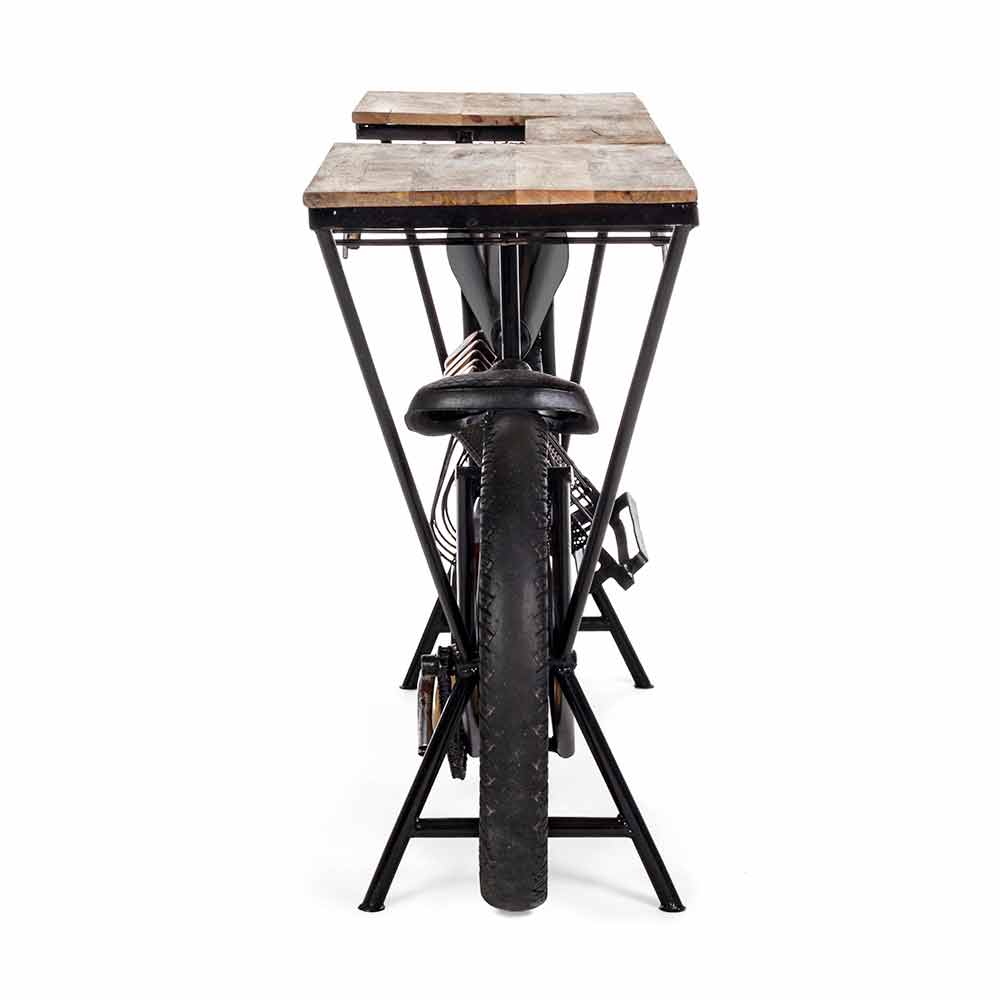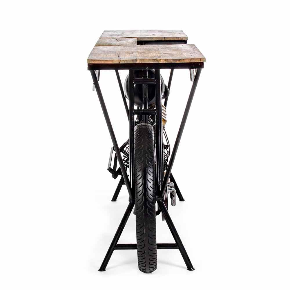 Diese Designkonsole hat eine besondere und interessante Form, die an die Struktur des bekannten Motors der 1950er Jahre erinnert. Die Basis, einschließlich der Räder, besteht aus Stahl , während die Oberseite aus Mangoholz besteht und Flaschenhalter enthält.