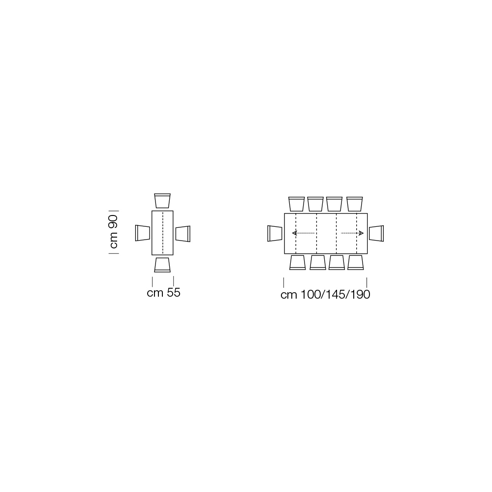 • L 55 (190) x T 90 x H 77 cm 10-Sitzer ausziehbar mit drei externen Verlängerungen von jeweils 45 cm;