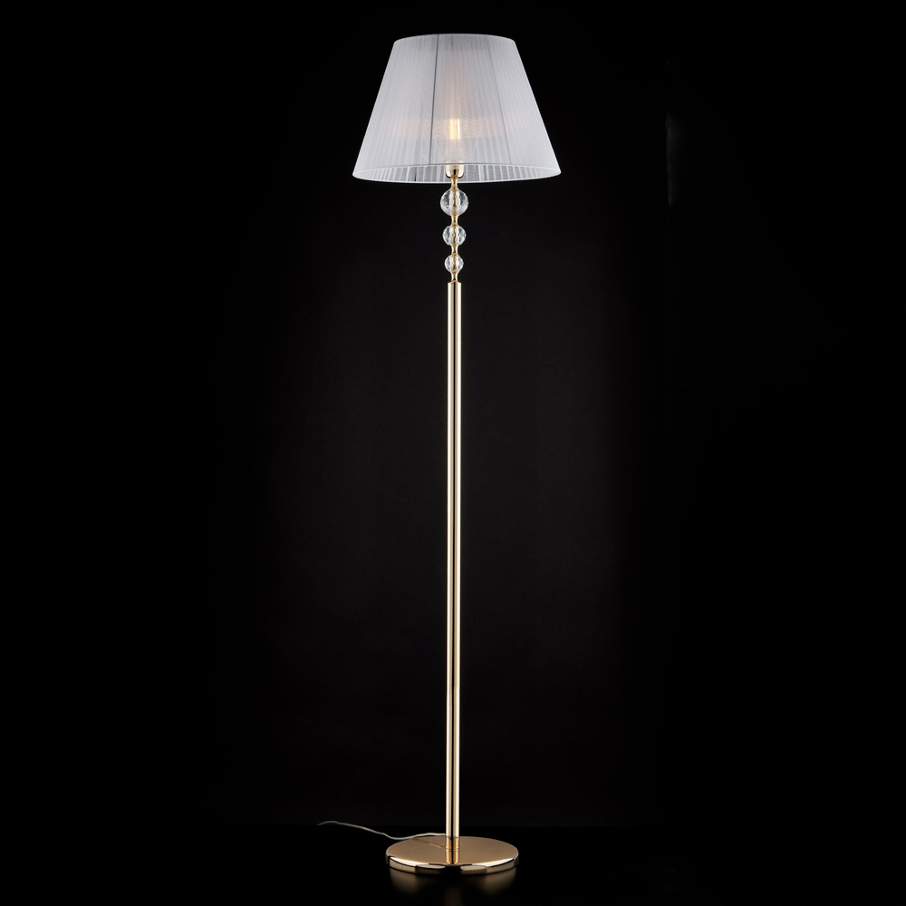 Diese schlanke und elegante Stehleuchte aus vergoldetem Eisen und Kristall ist eine raffinierte Beleuchtungslösung, die Räume mit einem sanften, einladenden Licht erfüllt. Die vertikale Struktur, verziert mit klaren Kristallelementen , verleiht dem Design Helligkeit und Leichtigkeit, während der Stoffschirm das Licht sanft streut und so eine warme und stilvolle Atmosphäre schafft.