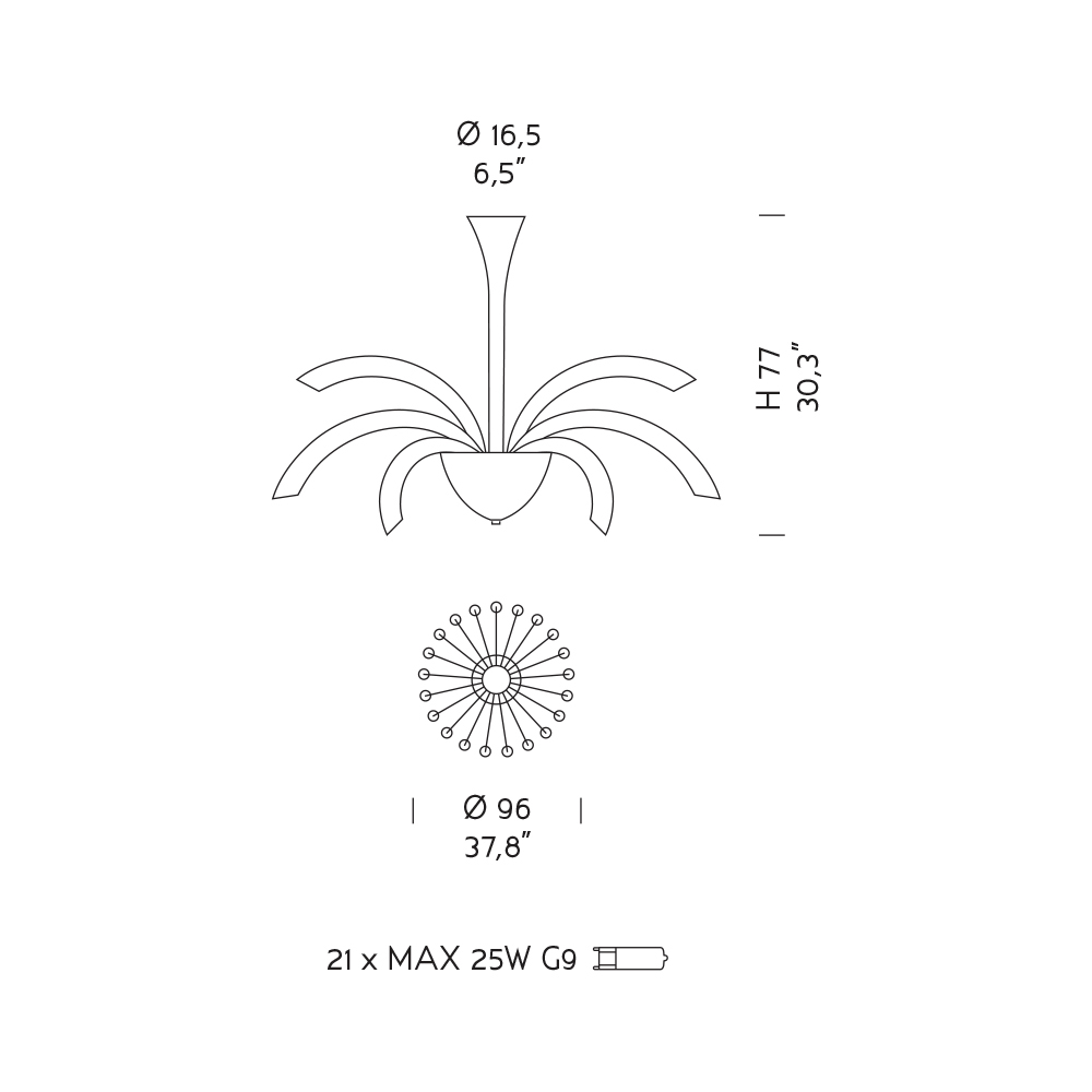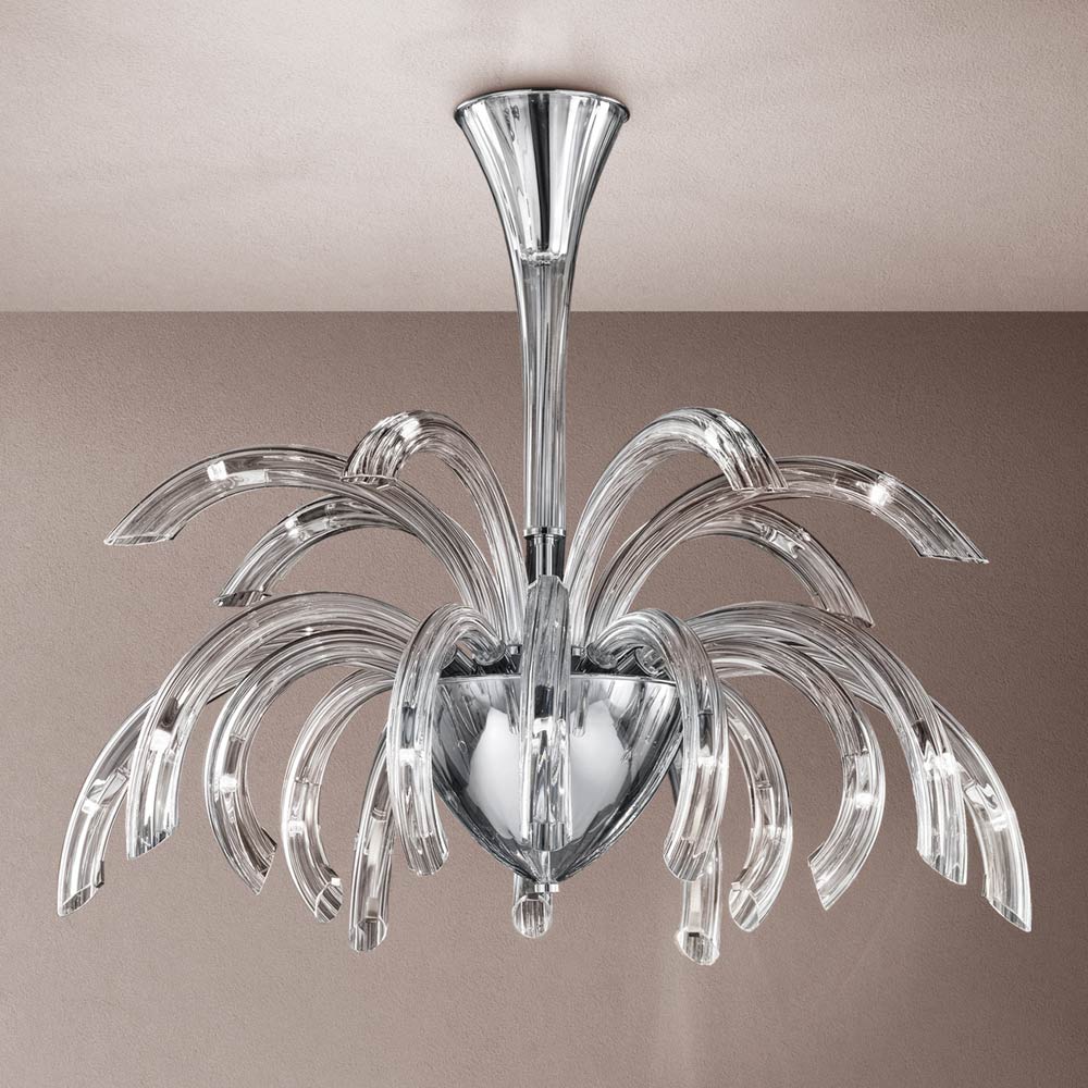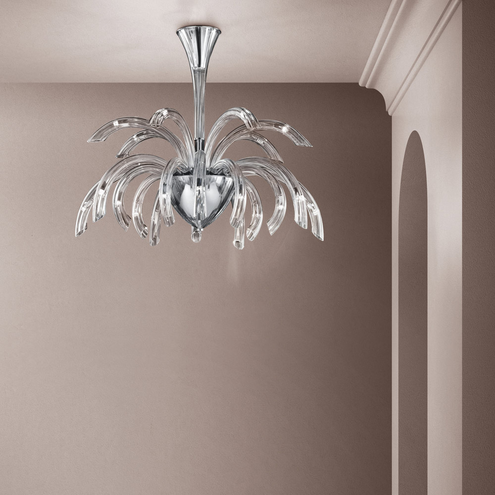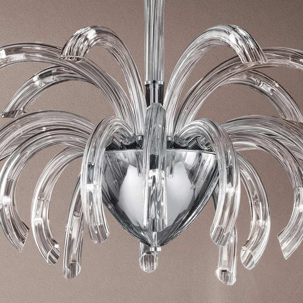 Kronleuchter mit 21 Lichtern aus handgefertigtemGlas aus Venedig mit Kristall-Finish und angereichert mit Details aus verchromtem Metall . Eine faszinierende Ästhetik, die sich dank ihrer Formen und der Funktionalität ihres Designs an jede Art von Umgebung anpasst, in die sie sich mit Überschwänglichkeit einfügt. Die wunderschönen und elegant geschwungenen Arme erweitern sich nach außen, um Licht in verschiedene Richtungen zu bringen und den Raum durch einen originellen szenografischen Effekt zu beleuchten, der an die Explosion eines Feuerwerks erinnert, um ein kreatives , raffiniertes und starkes visuelles Ergebnis zu erzielen.