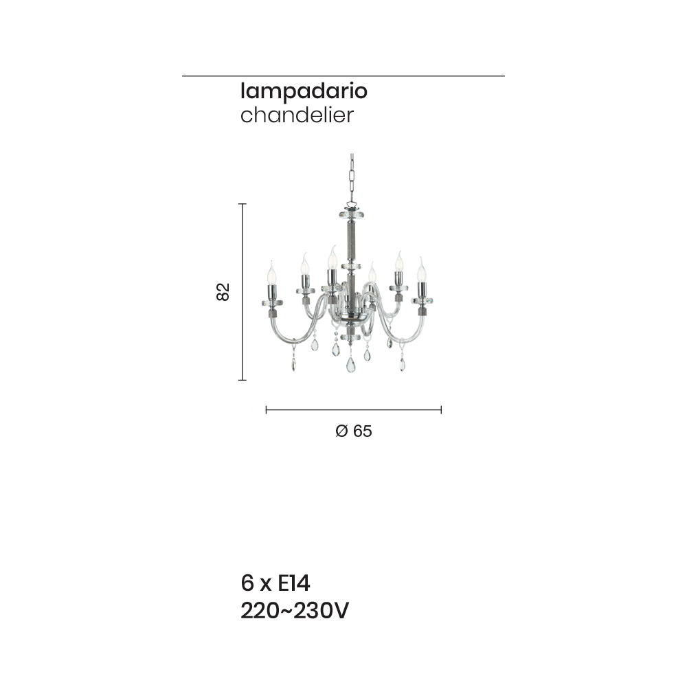 6-flammiger Kronleuchter aus handgefertigtem Glas, Kristall und Metall, Luxus, hergestellt in Italien.