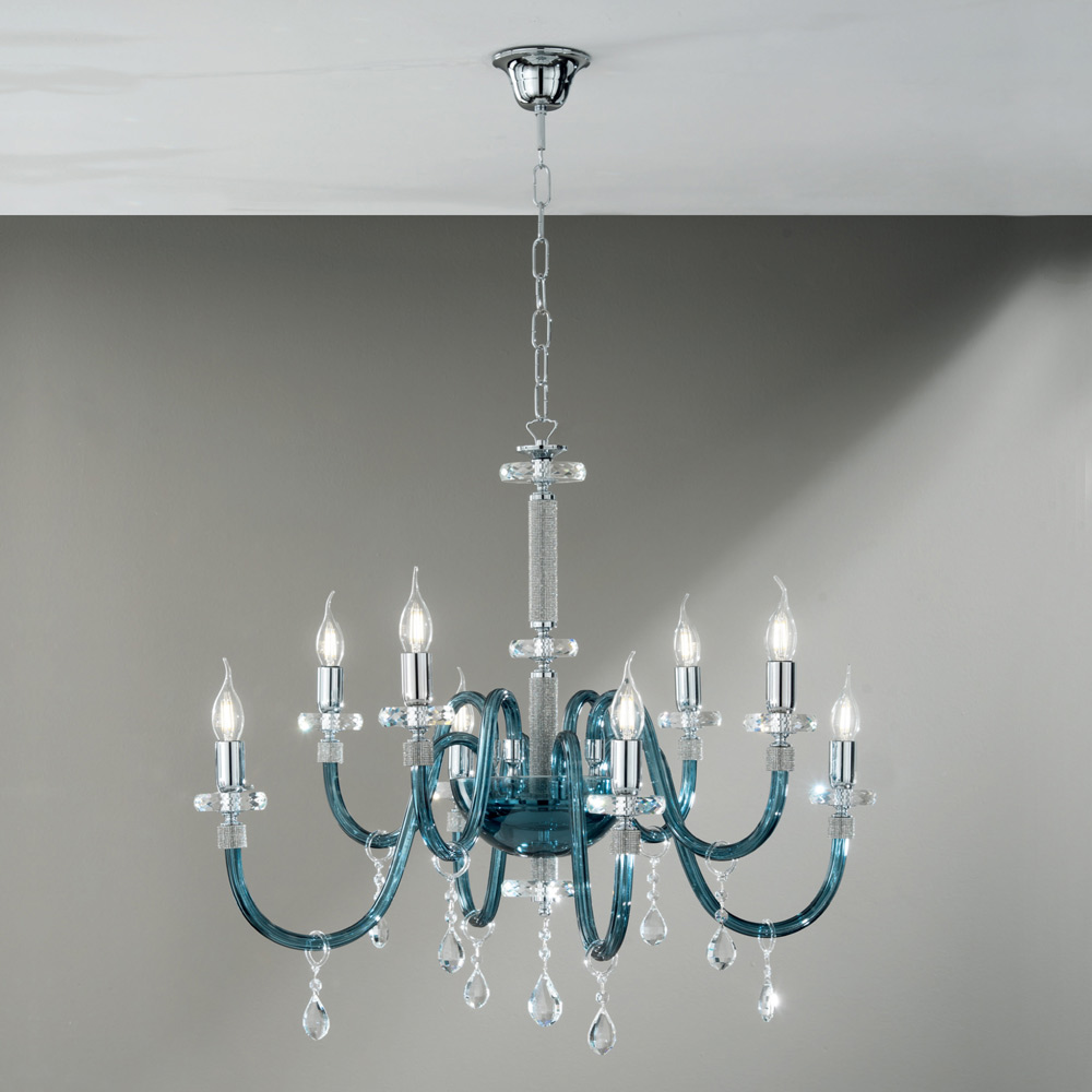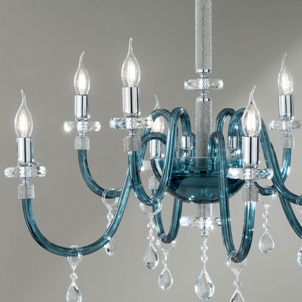 Dieser Hängeleuchter im klassischen Stil besteht aus 8 gewölbten Armen aus in Italien handgefertigtem Glas in Blaugrün mit „Rigaton“-Effekt, deren Ende sowie der mittlere Teil der Ergänzung von im Metall eingelassenem Glitzer umgeben sind , wobei zwei kreisförmige Röhrenscheiben die Struktur tragen, dazwischen zwei kreisförmige Scheiben unterschiedlicher Größe aus geschliffenem Kristall.
