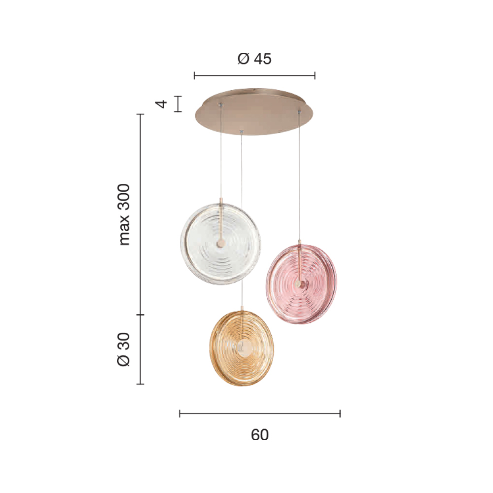 Komplett in Italien hergestellterKronleuchter aus goldfarben lackiertem Metall,mit konzentrischen bernsteinfarbenen, rosafarbenen und transparenten Linien verziertes Glas mit dimmbarem LED- Licht und längenverstellbarem Kabel . Ziel dieses Produkts ist es, die Tradition durch einen zeitgenössischen Ansatz aufzuwerten, bei dem Stil, Klasse und Innovation zu neuen Designformeln verschmelzen, um jede Umgebung mit Geschmack und Charakter einzurichten und zu beleuchten. Stärken sind die Besonderheit der Formen , die Qualität der Materialien und die Einzigartigkeit der Lichtquelle .