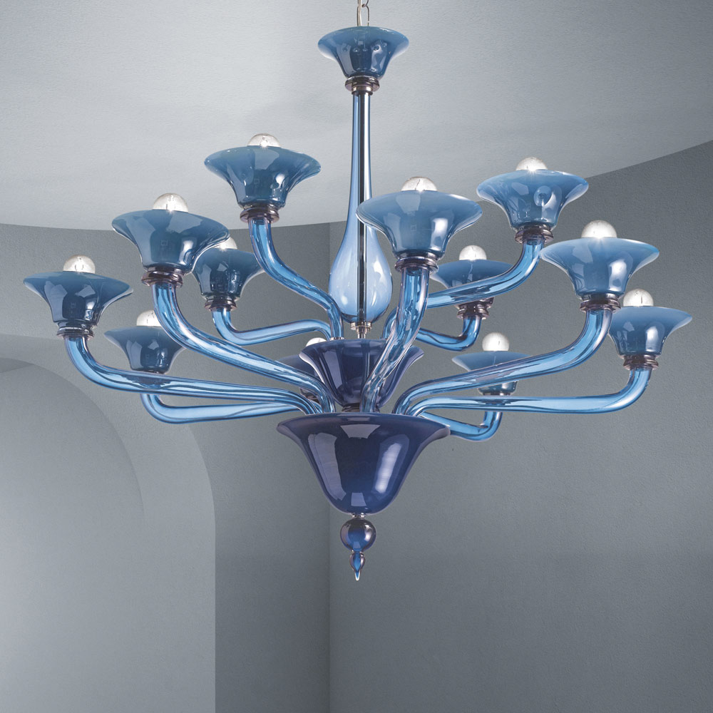 Handgefertigter Kronleuchter mit 12 Lichtern aus blauem venezianischem Glas Made in Italy.
