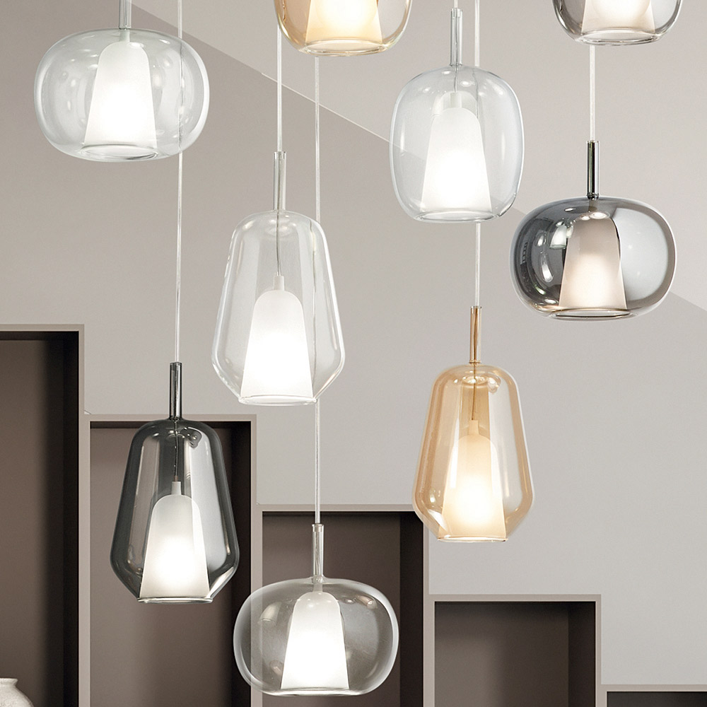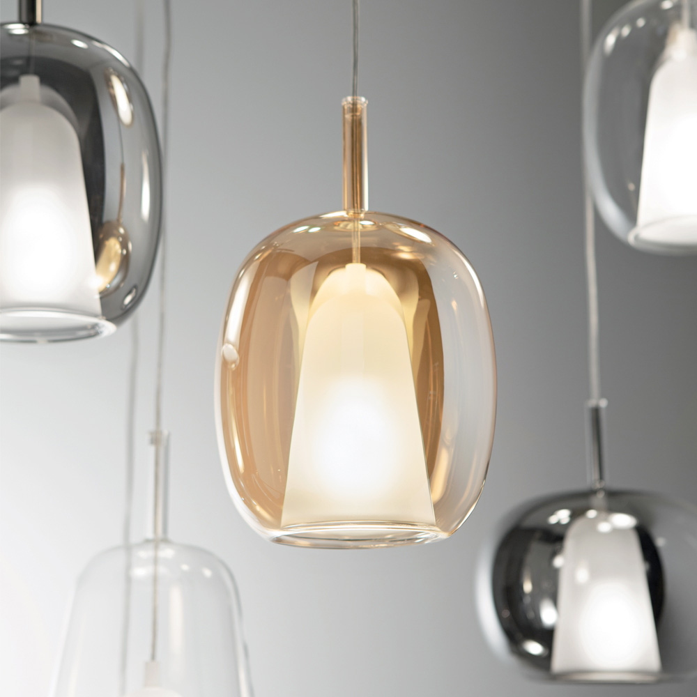 Kronleuchter mit Deckensockel aus Goldmetall und Diffusoren aus geblasenem Glas , gekennzeichnet durch eine Doppelschicht: innen aus satiniertem Glas und außen aus farbigem Glas . Kappe aus Polymermaterial zur Stabilisierung des Kabels in einer zentralen Position. Verstellbare Kabel mit einer maximalen Länge von 250 cm.