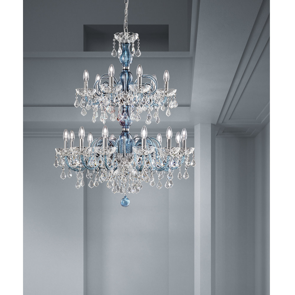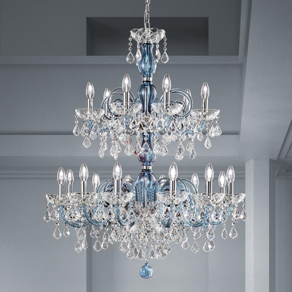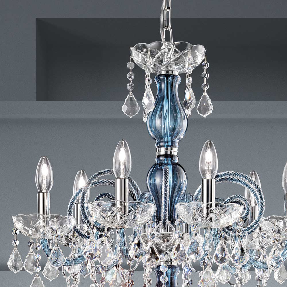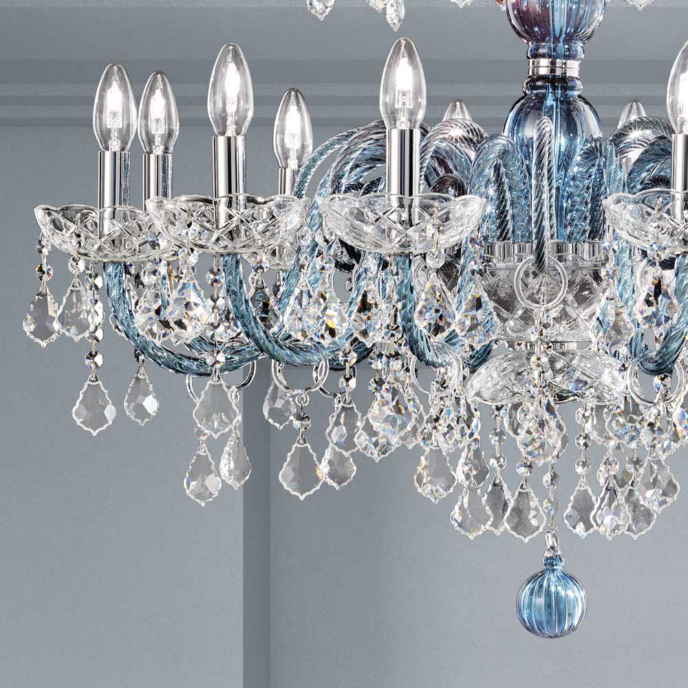 18-flammiger Kronleuchter aus venezianischem Glas in Denim-Optik mit Bleianhängern und poliertem verchromtem Metall . Diese handwerklich hergestellte Ergänzung zeichnet sich durch die wunderbaren Arme aus, die von Hand durch die Drehtechnik bearbeitet wurden, die ein exklusives Ergebnis schafft, das ästhetisch an die Verflechtung eines Seils erinnert und dem Kronleuchter Persönlichkeit verleiht. Ein echter Lichtregen dringt in die Struktur des Kronleuchters ein und breitet sich dann durch Brechung durch die Magie von Pailletten und Kristallanhängern mit feinen Oberflächen in der Umgebung aus und erzeugt so einen eindrucksvollen und traumhaften szenografischen Effekt , der verzaubern und überraschen kann. für seine Eleganz und Majestät .