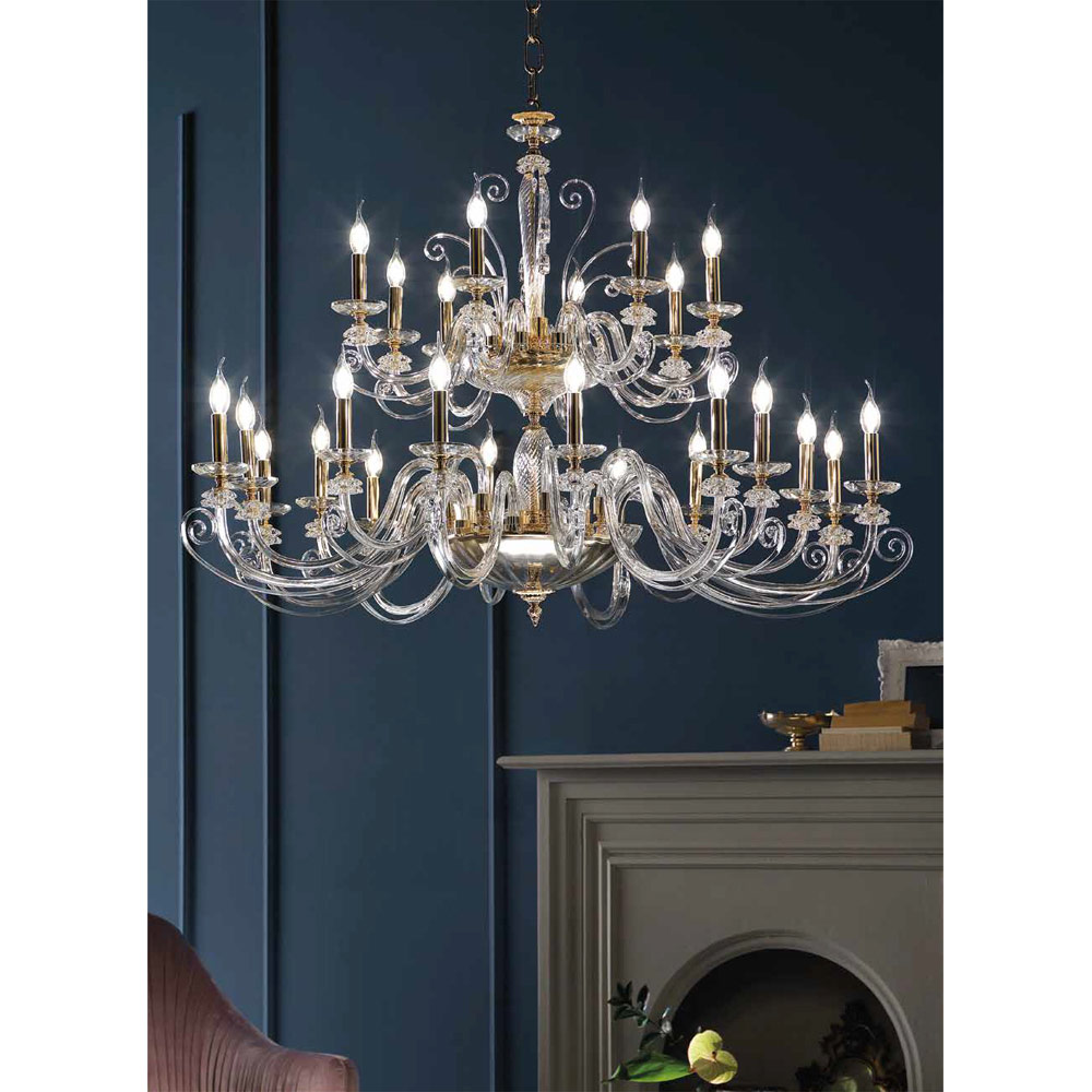Der 24-Licht- Kronleuchter ist ein luxuriöses Beleuchtungszubehör , das vollständig in Italien handgefertigt wird und eine Struktur mit metallischen Oberflächen kombiniert mit mundgeblasenem Glas und hochwertigem optischem Kristall aufweist. So erwacht das Design im klassischen Stil vergangener Zeiten zum Leben, dessen Charme zum Protagonisten im Zielraum wird.
