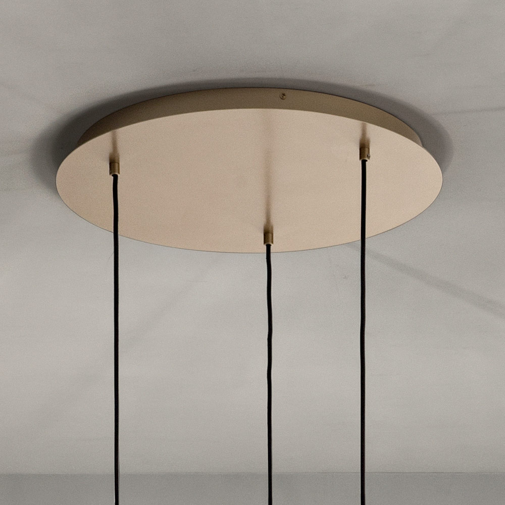 Kronleuchter aus geblasenem Glas in Kugelform mit halbkugelförmiger Linie, die in zwei Teile geteilt ist: einen transparenten und einen farbigen. Rahmen aus mattschwarz lackiertem Metall und Deckensockel aus goldfarbenem Metall . Verstellbare Kabel mit einer maximalen Länge von 250 cm.