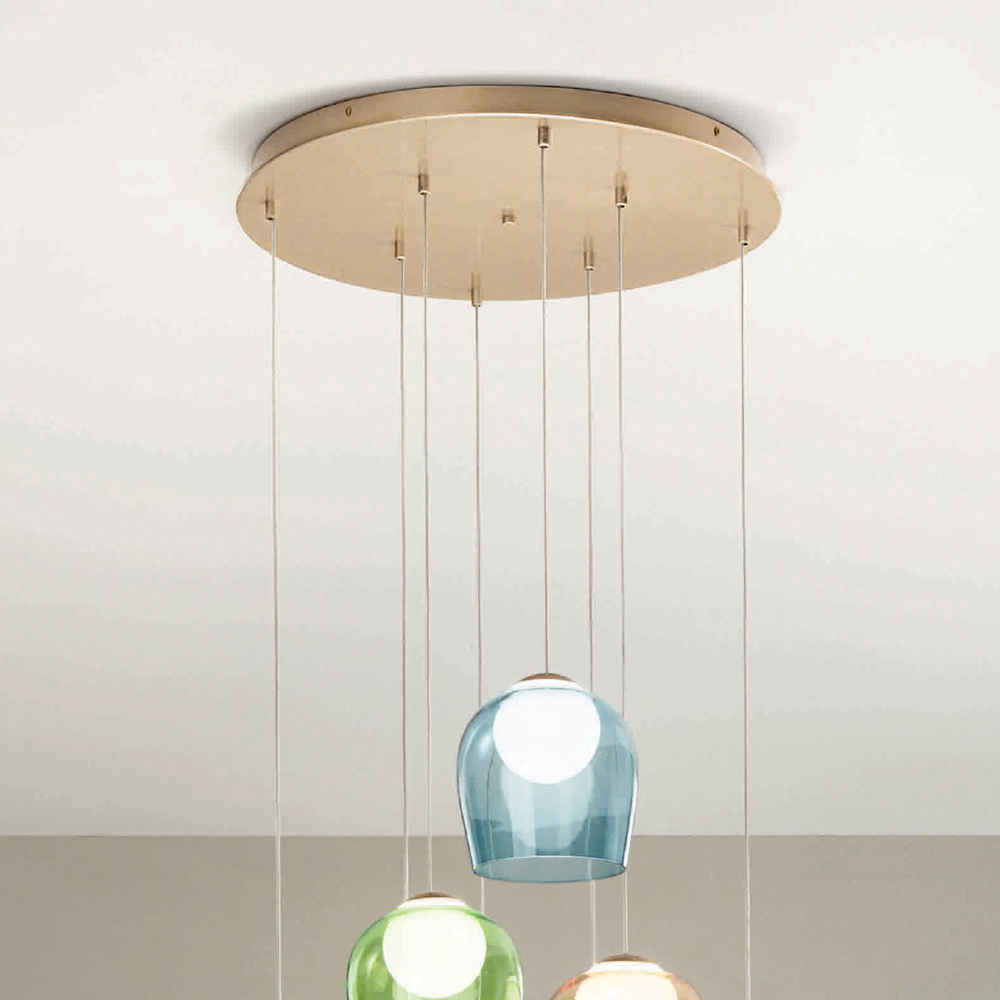 Komplett in Italien hergestellterKronleuchter aus goldfarben lackiertem Metall und 8 LED-Leuchten mit optionalem Lampenschirm aus farbigem Glas , der durch Abschrauben der Glaskugel entfernt werden kann. Ziel dieses Produkts ist es, die Tradition durch einen zeitgenössischen Ansatz aufzuwerten, bei dem Stil, Klasse und Innovation zu neuen Designformeln verschmelzen, um jede Umgebung mit Geschmack und Charakter einzurichten und zu beleuchten. Stärken sind die Besonderheit der Formen , die Qualität der Materialien und die Einzigartigkeit der Lichtquelle .