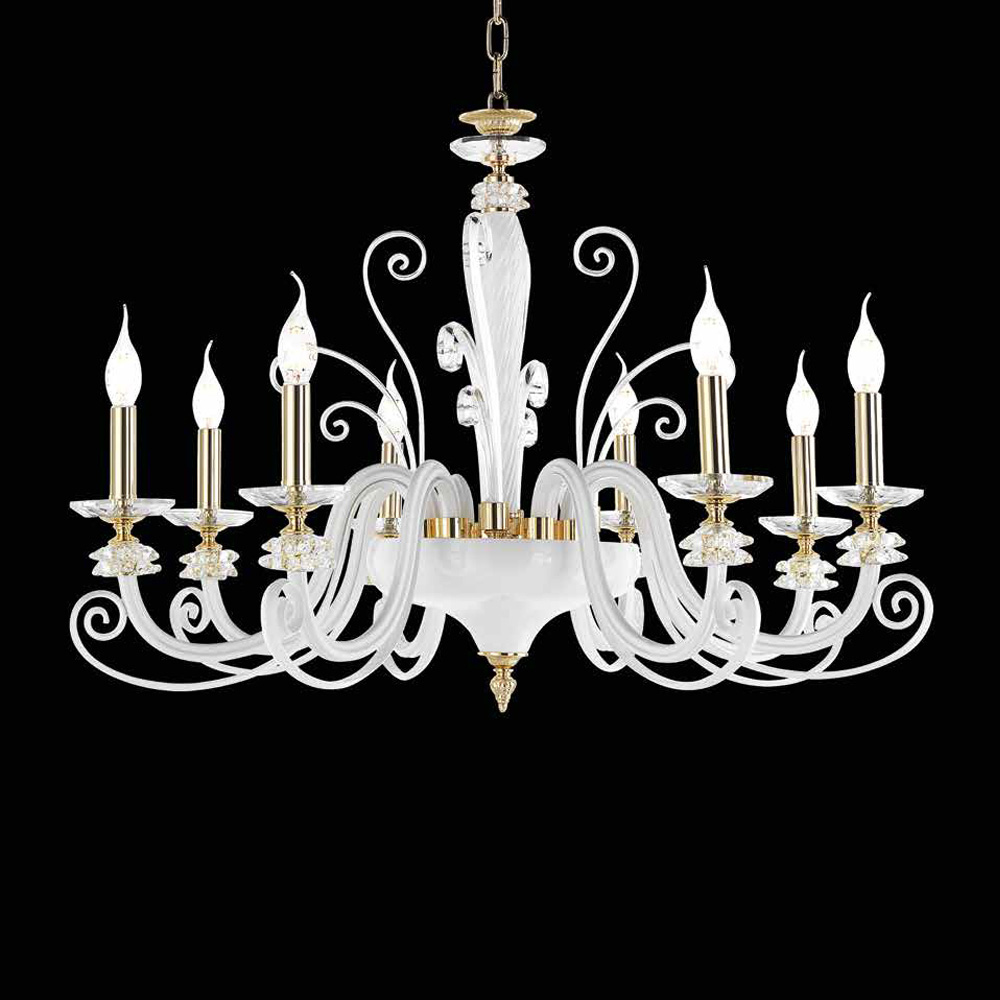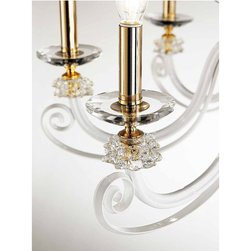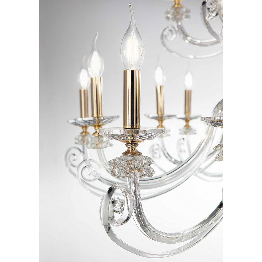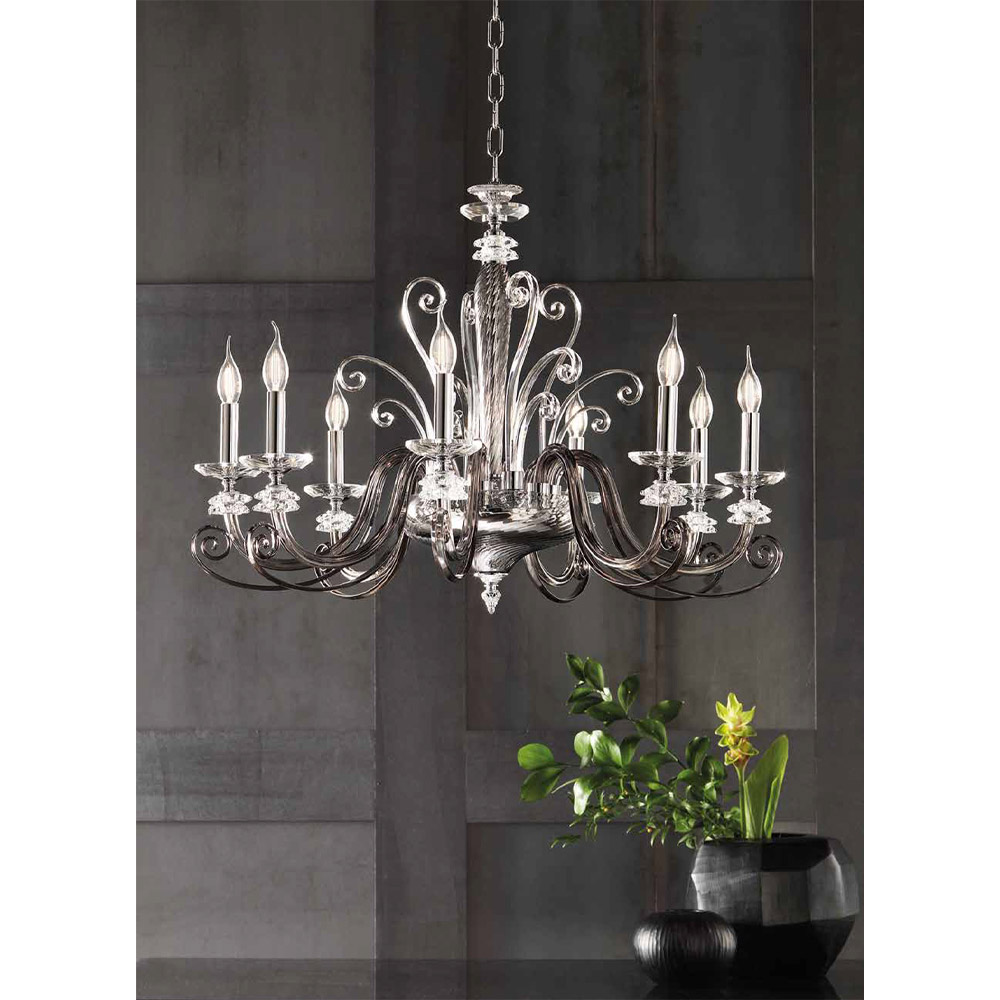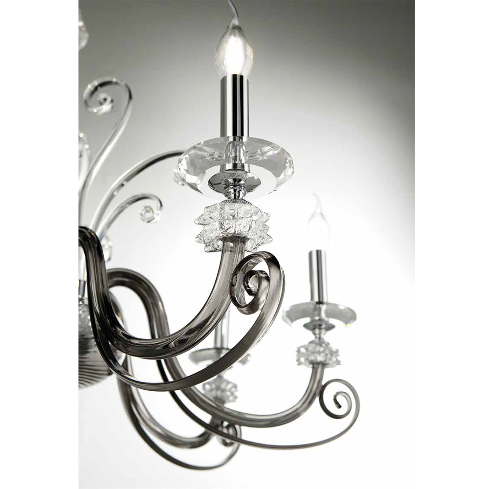 Der 8-Licht- Kronleuchter ist ein luxuriöses Beleuchtungszubehör , das vollständig in Italien handgefertigt wird und eine Struktur mit metallischen Oberflächen kombiniert mit mundgeblasenem Glas und hochwertigem optischem Kristall aufweist. So erwacht das Design im klassischen Stil vergangener Zeiten zum Leben, dessen Charme zum Protagonisten im Zielraum wird.