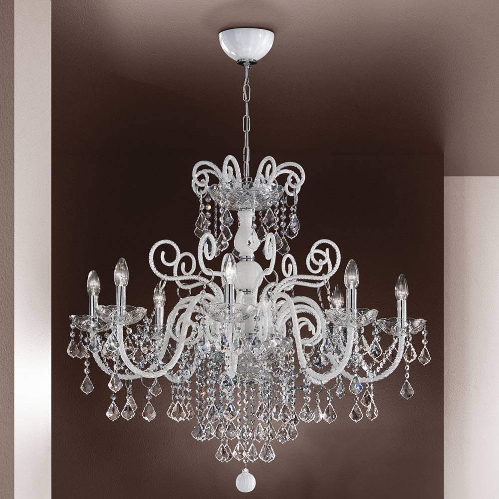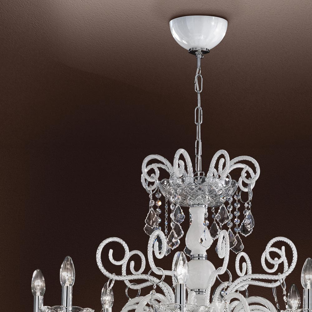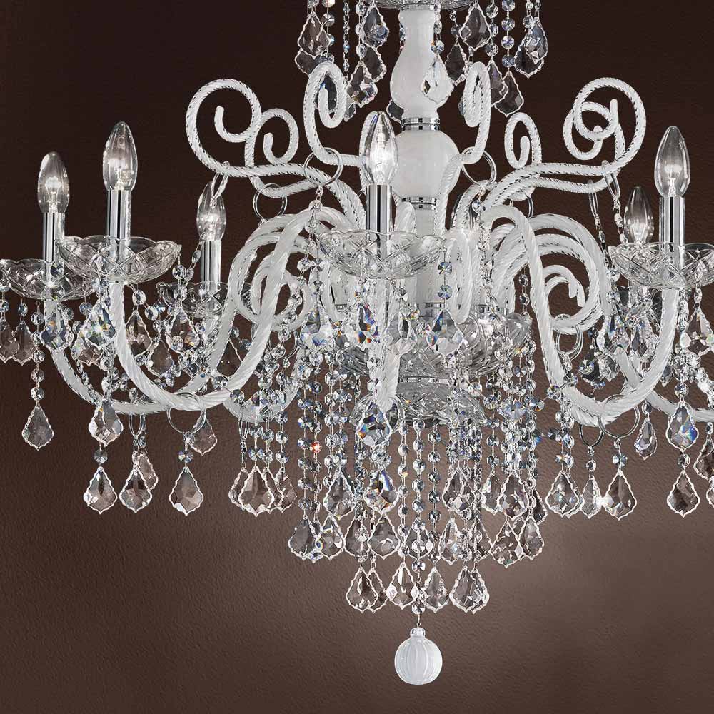 8-flammiger Kronleuchter aus venezianischem Glas mit milchweißem Finish mit Bleianhängern und poliertem verchromtem Metall . Diese handwerklich hergestellte Ergänzung zeichnet sich durch die wunderbaren Arme aus, die von Hand durch die Drehtechnik bearbeitet wurden, die ein exklusives Ergebnis schafft, das ästhetisch an die Verflechtung eines Seils erinnert und dem Kronleuchter Persönlichkeit verleiht. Ein echter Lichtregen dringt in die Struktur des Kronleuchters ein und breitet sich dann durch Brechung durch die Magie von Pailletten und Kristallanhängern mit feinen Oberflächen in der Umgebung aus und erzeugt so einen eindrucksvollen und traumhaften szenografischen Effekt , der verzaubern und überraschen kann. für seine Eleganz und Majestät .