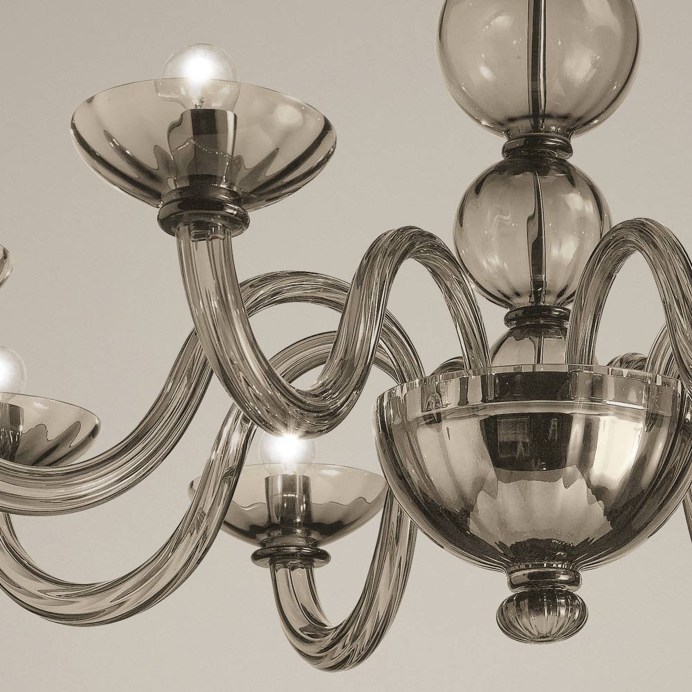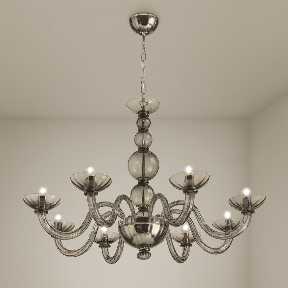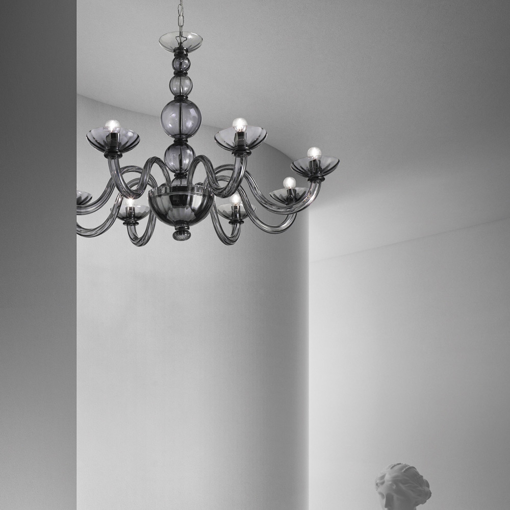raffinierte Rundungen auszeichnet, die sich perfekt an klassische Umgebungen, aber gleichzeitig auch an Räume mit zeitgenössischem Stil anpassen. Das Element der Tradition wird durch seine wunderbaren Komponenten aus vollständig von Hand gefertigtem mundgeblasenem Glas unterstrichen, das sich dank trendiger Farben verwandelt, um sich selbst zu aktualisieren. Seine
