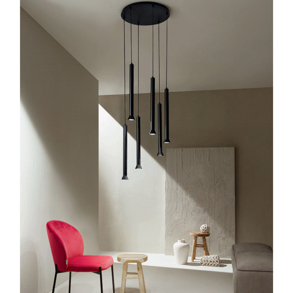 Komplett in Italien hergestellterKronleuchter aus schwarz lackiertem Metall. Ziel dieses Produkts ist es, die Tradition durch einen zeitgenössischen Ansatz aufzuwerten, bei dem Stil, Klasse und Innovation zu neuen Designformeln verschmelzen, um jede Umgebung mit Geschmack und Charakter einzurichten und zu beleuchten. Stärken sind die Besonderheit der Formen , die Qualität der Materialien und die Einzigartigkeit der Lichtquelle .