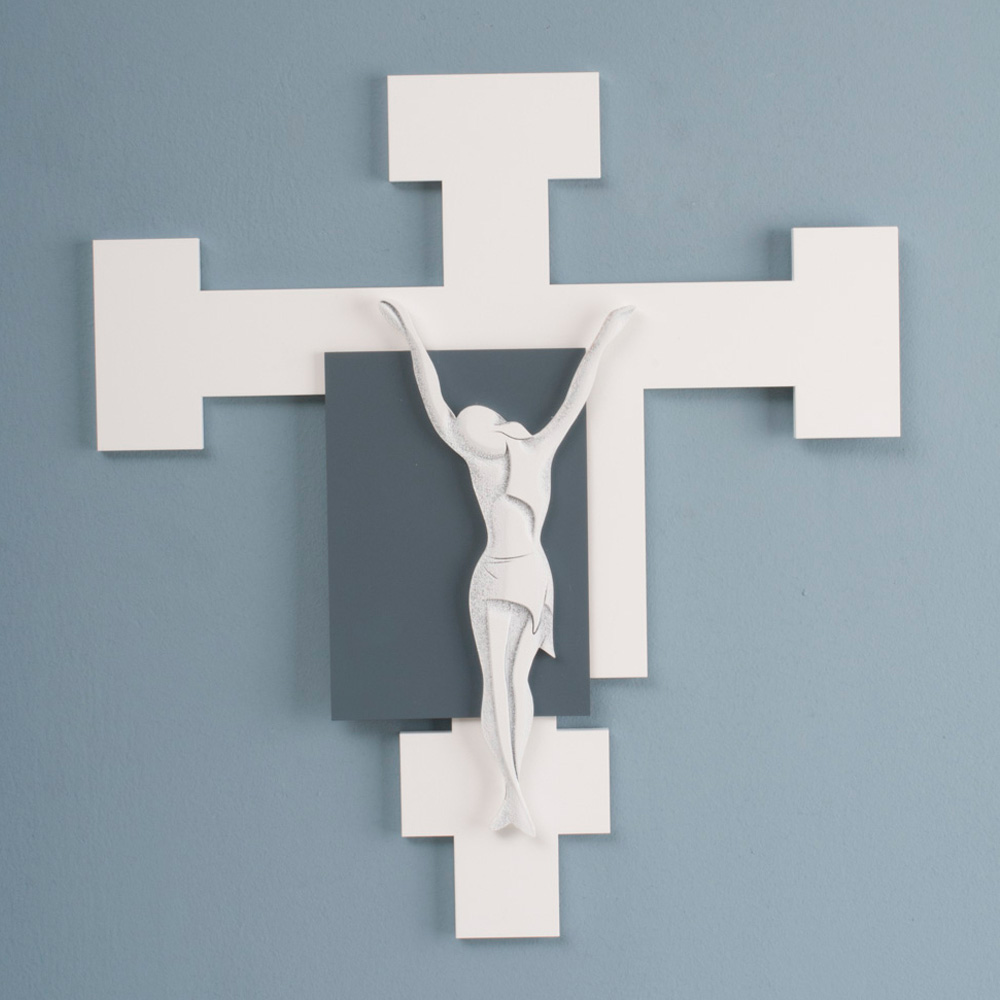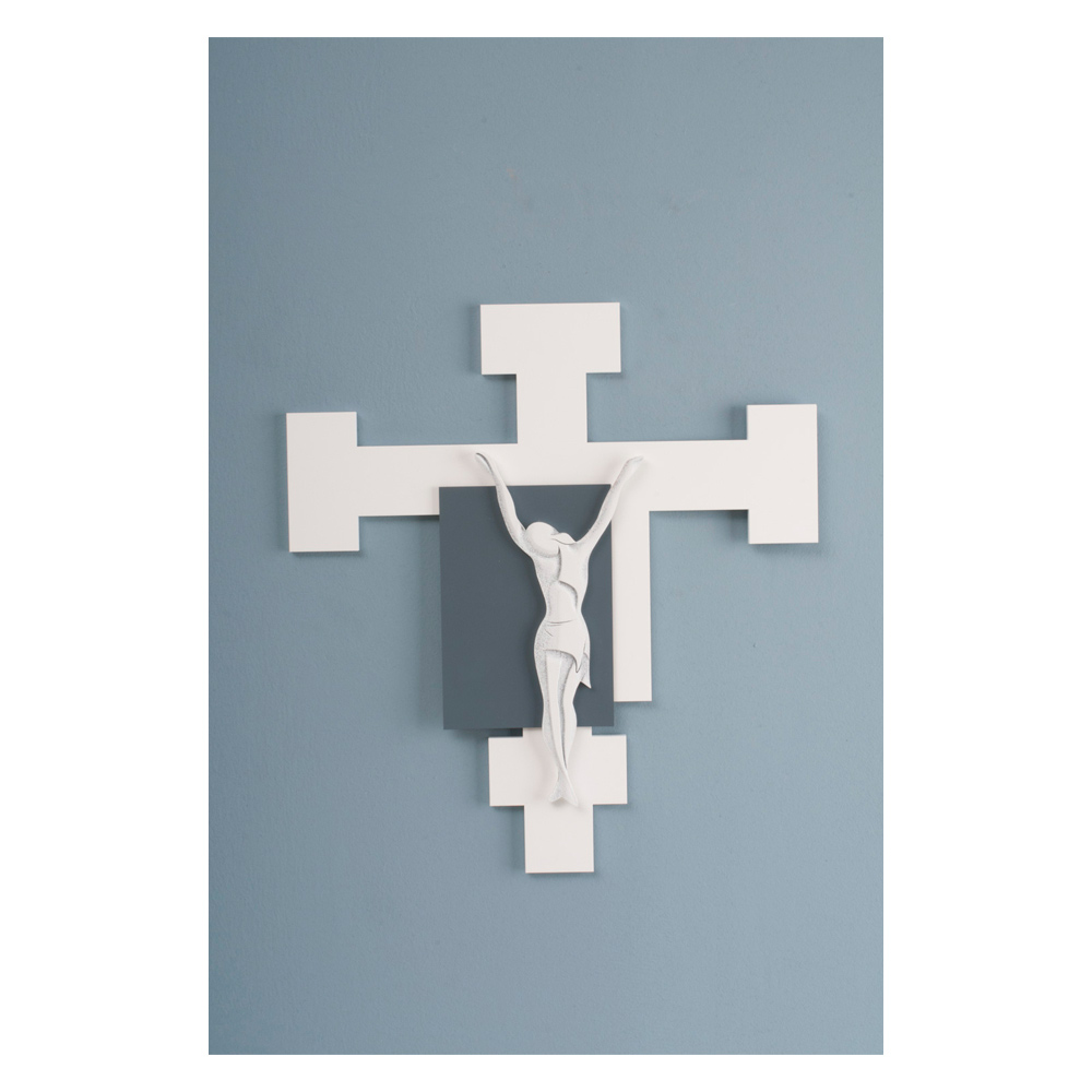 Kruzifix aus weiß lackiertem Holz mit Detailapplikation aus blau und weiß lackiertem Christus mit leichten Gravuren der Details des Körpers.