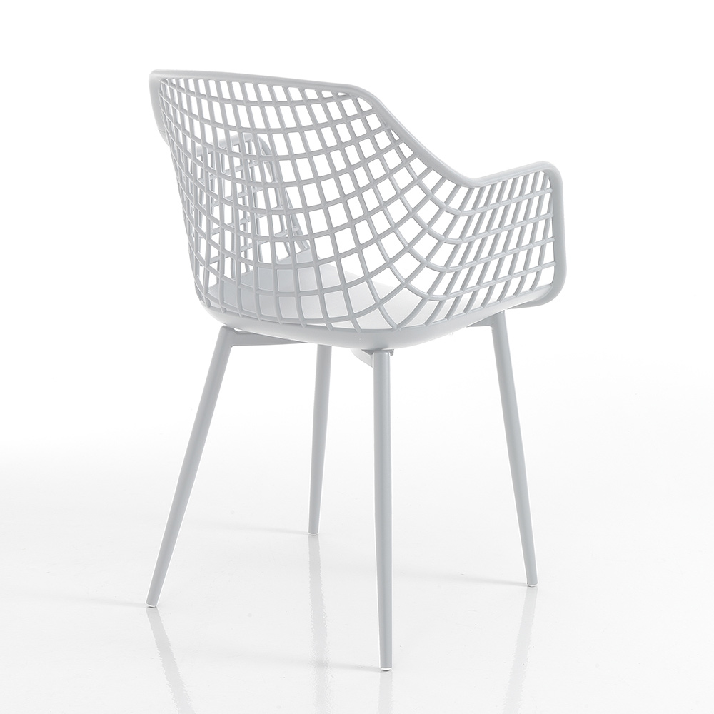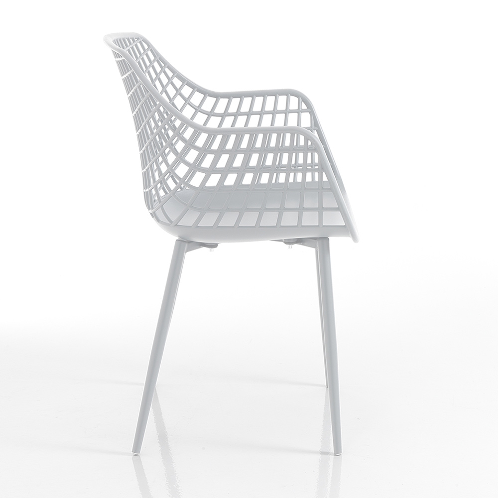 Küchenstuhl mit Sitz aus undurchsichtigem Polypropylen komplett mit Armlehnen und Beinen aus Stahl mit Schutzlackierung für die Außenseite. Ein einfacher und minimalistischer Sitz, dessen Ästhetik durch die besondere Verarbeitung bereichert und einzigartig wird, die die Rückenlehne auszeichnet und ihre Einzigartigkeit unterstreicht. Das Ergebnis ist ein besonders vielseitiger Stuhl, der sich ideal für die unterschiedlichsten Wohnumgebungen eignet, aber auch für Objektbereiche wie Bars und Restaurants, wo er den Möbeln einen Hauch von Originalität verleiht.
