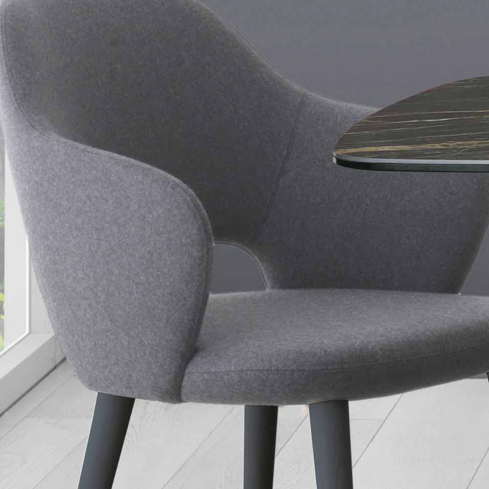 Küchenstuhl made in Italy mit Korpus aus Stahl, geformt aus kaltgeschäumtem Polyurethan mit Stoffbezug und Holzsockel mit mattem Eschenfinish. Eine Ästhetik mit Liebe zum Detail, die sich jeder modernen Stilsituation anpasst, den Look mit einer exklusiven und raffinierten Note bereichert und gleichzeitig für einen einladenden Sitz sorgt. Eine Idee von modernen und vielseitigen Möbeln, die aus dem Wunsch entspringt, ein Produkt zu schaffen, das dank eines komfortablen und umhüllenden Designs die Freude am Bewirten und Teilen der Zeit steigern kann.
