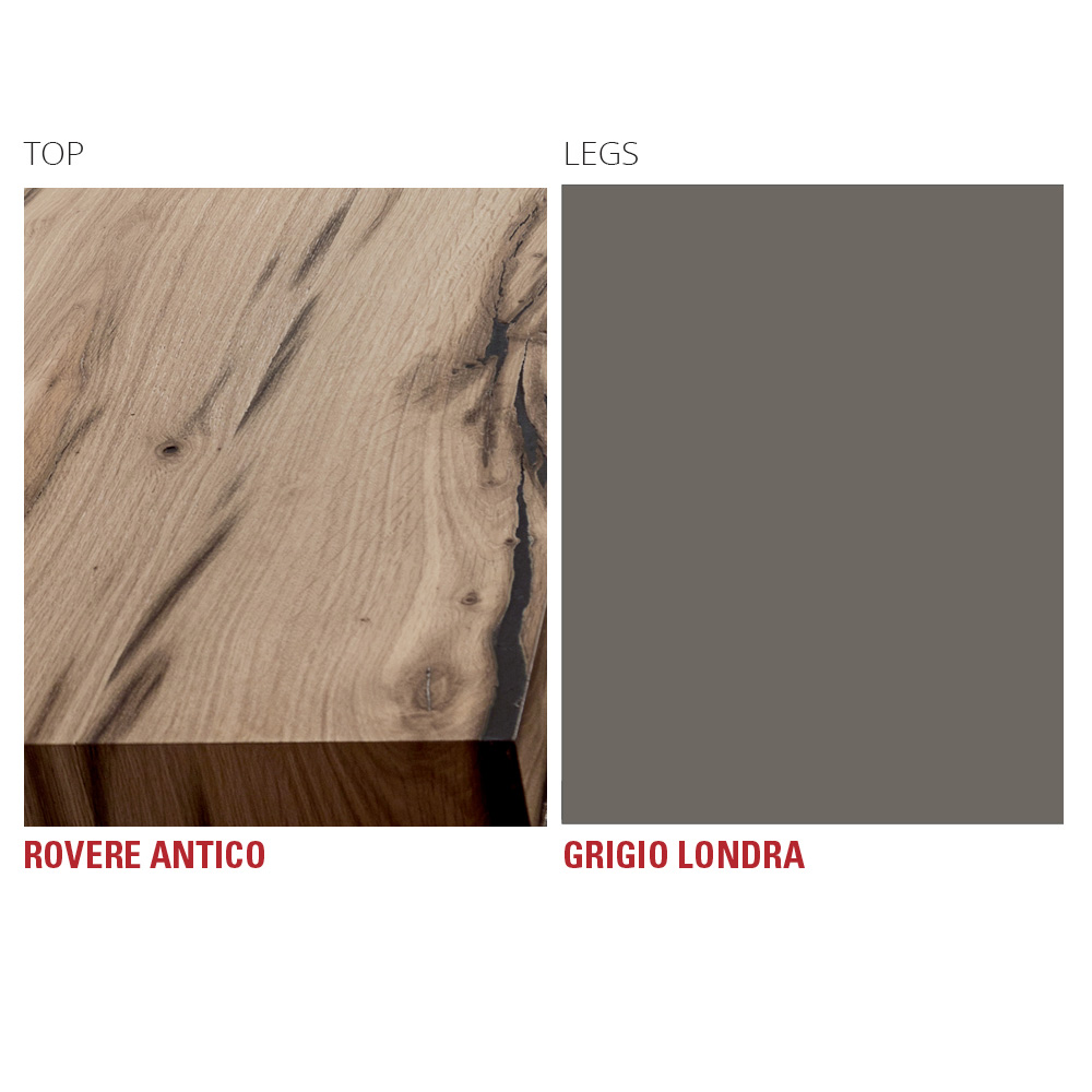 Esstisch aus furnierter Platte in Antik-Eichen-Finish (Dicke 6 cm) und mit Epoxidpulvern lackierten Metallbeinen . Aus der Herstellung zu 100 % Made in Italy und der Verwendung hochwertiger Rohstoffe entsteht ein solider und widerstandsfähiger Artikel für die Einrichtung von Esszimmern oder modernen Küchen, der sich durch ein imposantes und majestätisches Design auszeichnet. Die zeitlose Eleganz des Holzes und seine wunderbaren Maserungen harmonieren perfekt mit einem Sockel mit fast futuristischen Formen, die dem Tisch seine revolutionäre Persönlichkeit verleihen und die perfekte Einrichtungslösung für diejenigen schaffen, die es lieben, ihre Umgebung auf exklusive Weise zu bereichern. Die glänzende Verarbeitung der Tischplatte macht dieses Accessoire auch dank der drei verfügbaren Farben des Untergestells äußerst funktional, die es ermöglichen, diskrete und elegante Kombinationen zu schaffen, die in der Lage sind, mit Stil und einem exklusiven Touch auf alle Bedürfnisse und Anforderungen einzugehen.