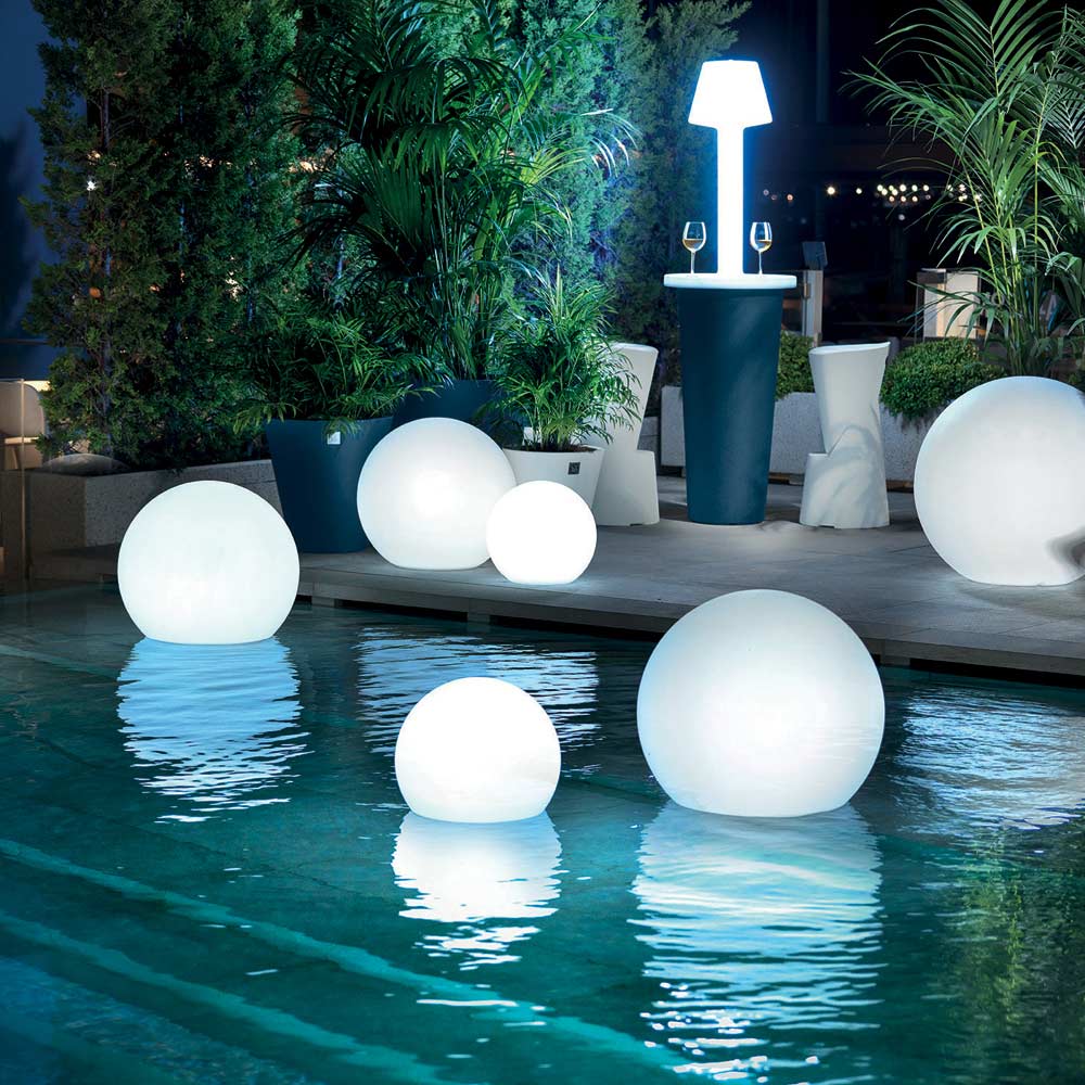 Kugelförmige Außenlampe aus perlmuttfarbenem Polyethylen. Made in Italy