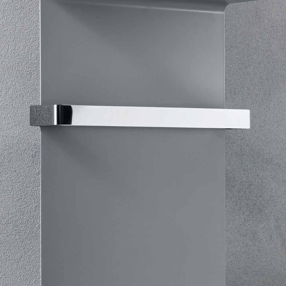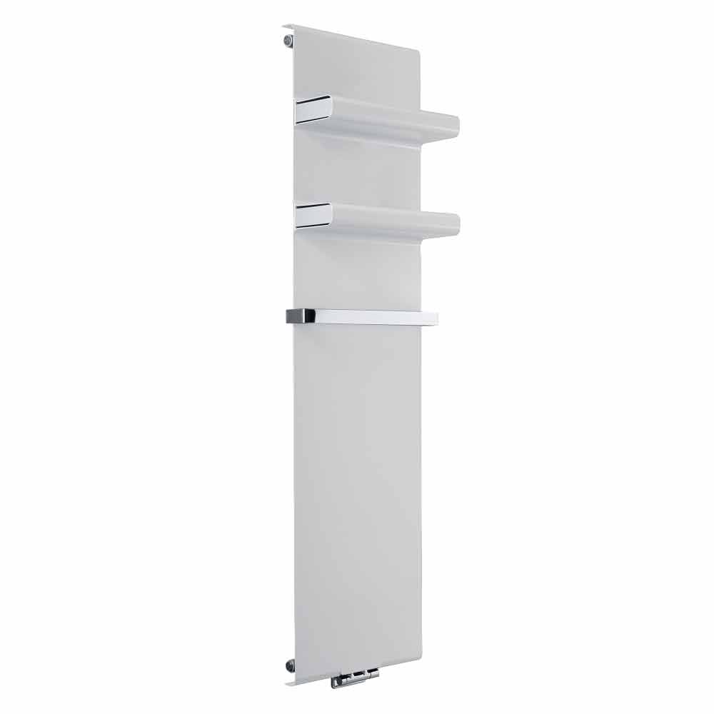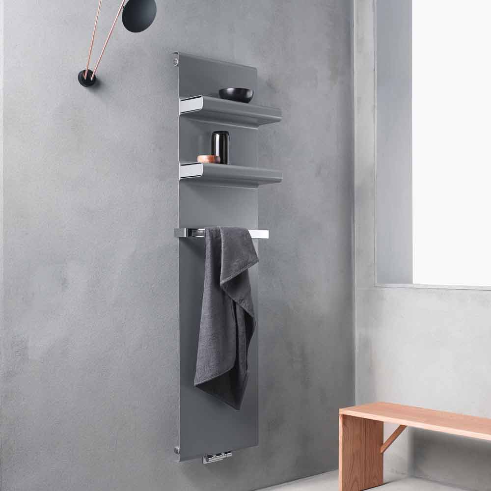 Diese hydraulische Strahlungsplatte verfügt über ein modernes und minimalistisches Design mit praktischen und eleganten integrierten Regalen mit Abdeckung und verchromtem Handtuchhalter, der die Kühlerbreite um 4 cm verlängert.