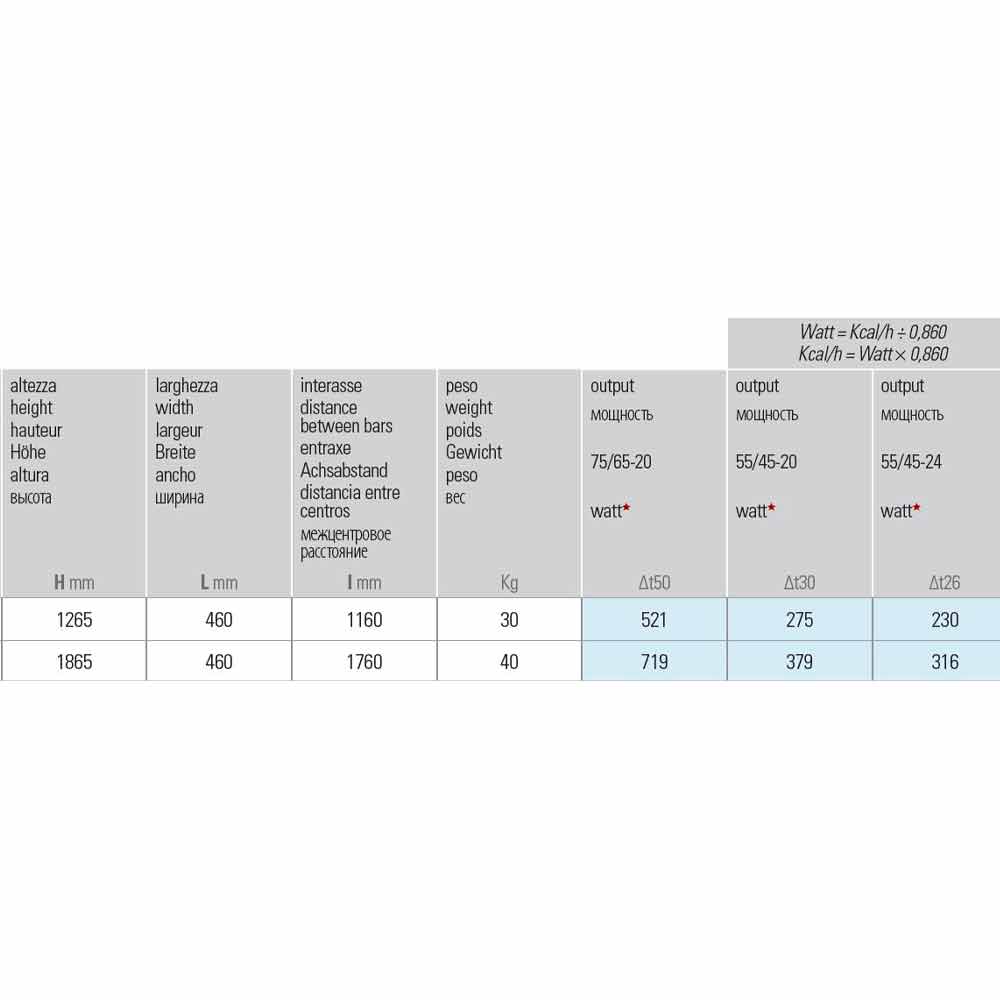 • H 1265 x L 460 x Inter. 1160 mm x Ausgang w (Δt50 *) 521; Ausbeute w (Δt30 *) 275; Ausgang w (Δt26 *) 230 (1 Regal);