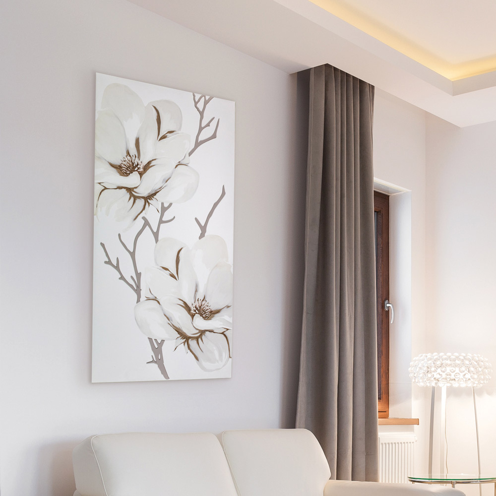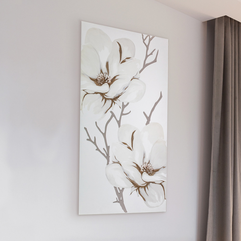 Das dekorierte Paneel wird mithilfe der Lasermarkierungstechnik hergestellt, die ein Flachrelief auf dem Material erzeugt und verschiedene Farbabstufungen der auf dem Paneel erzeugten Blütenblätter erzeugt. Das Magnolia-Paneel besteht aus mattweiß lackiertem Holz mit kieselfarbenen Applikationen. Ein elegantes Möbelstück mit zwei zarten Magnolienblüten, detailliert per Laser mit kieselfarbenen Verzierungen graviert.