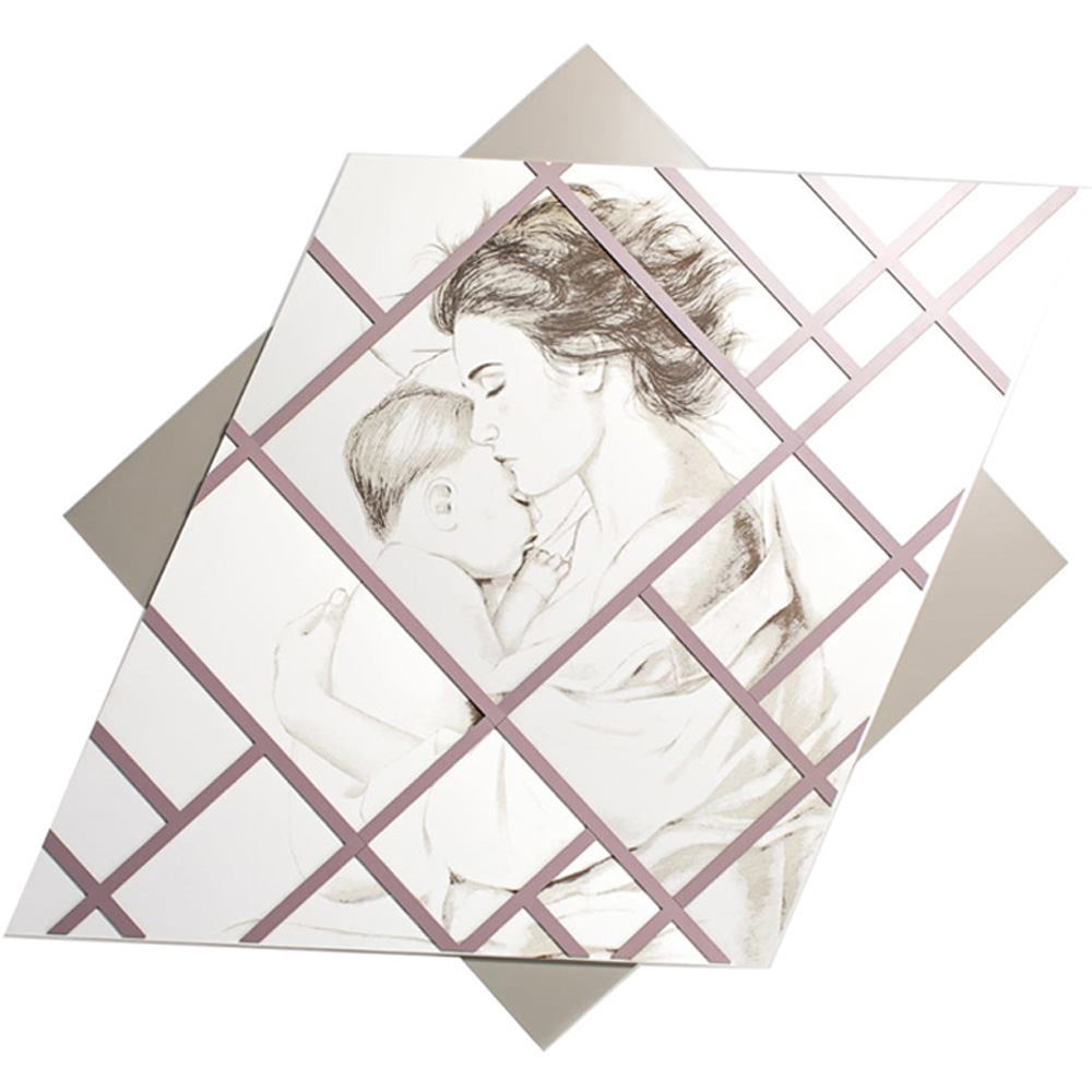 Ein Kopfteil, das Mutterschaft mit einer Umarmung zwischen Mutter und Kind darstellt, dank Lasermarkierung, die die Gesichtszüge zeigt. Mattweiß lackierte Holzplatte mit Lasermarkierung, einer speziellen Technik, die ein Flachrelief auf den Materialien erzeugt. Die Platte ist auf einer kieselfarbenen Platte eingraviert und in Samt oder Kakaorosa Ihrer Wahl dekoriert.
