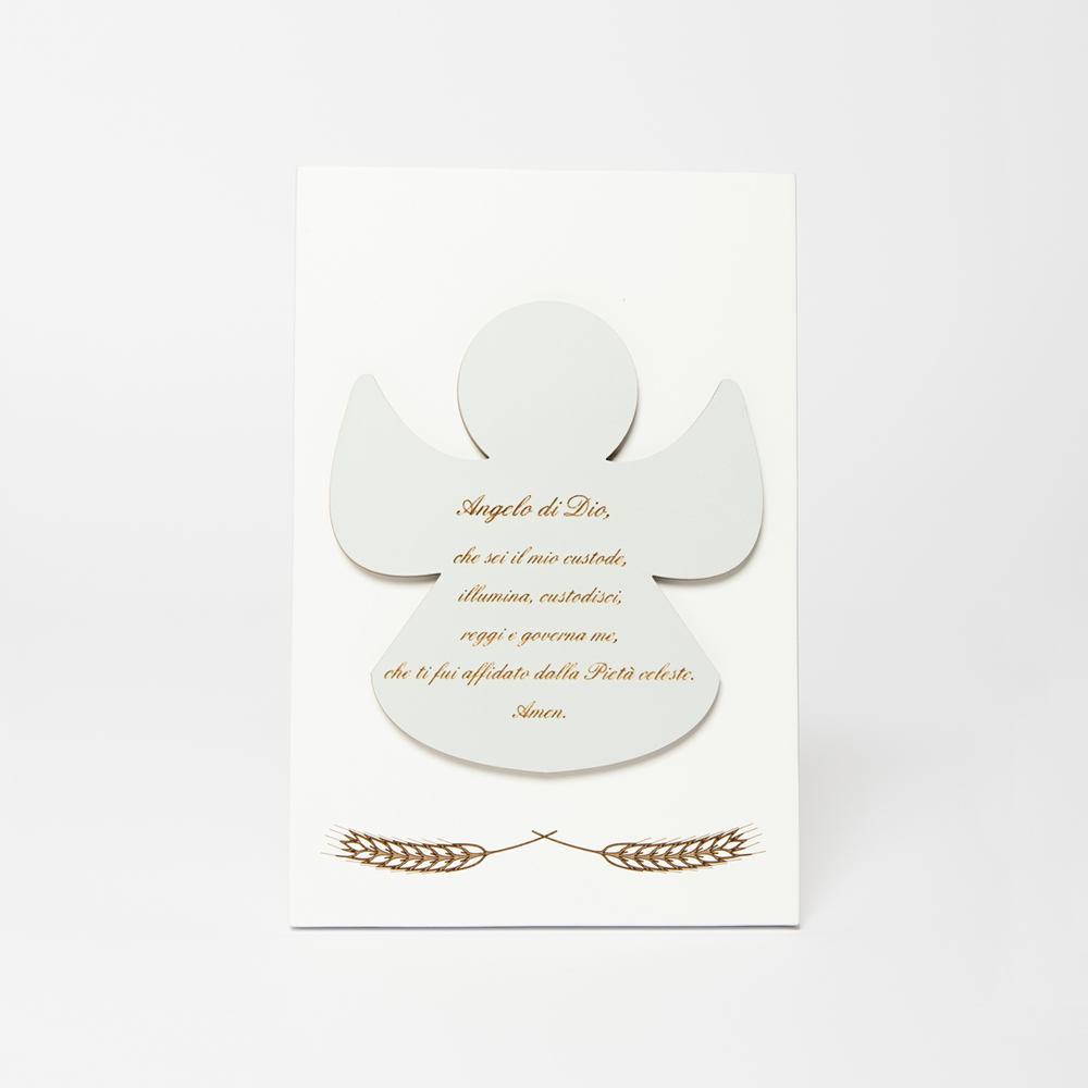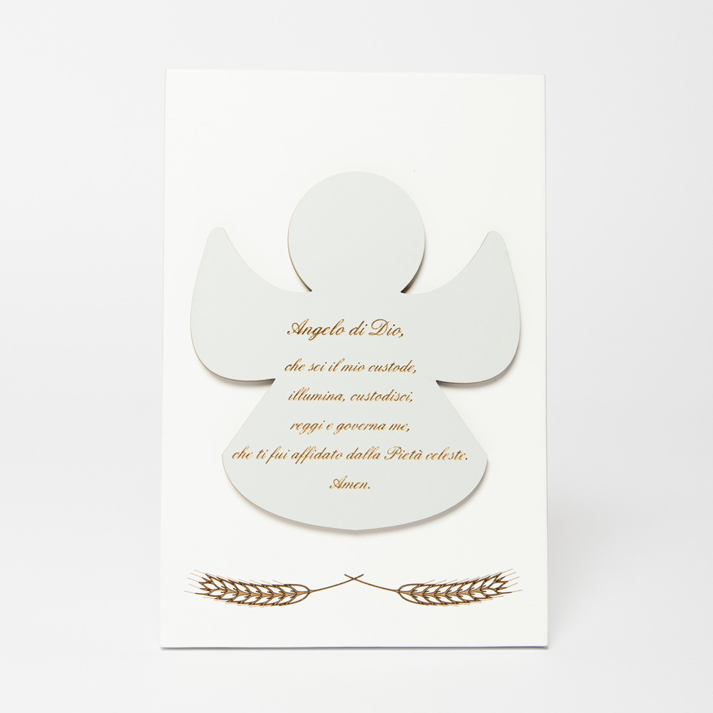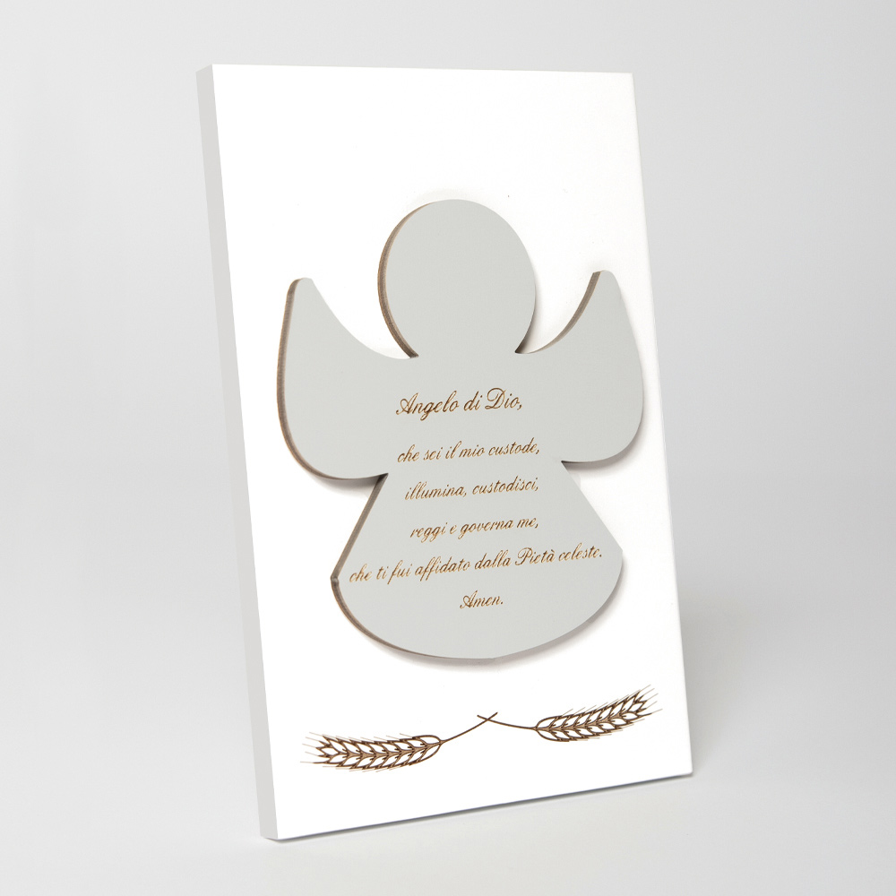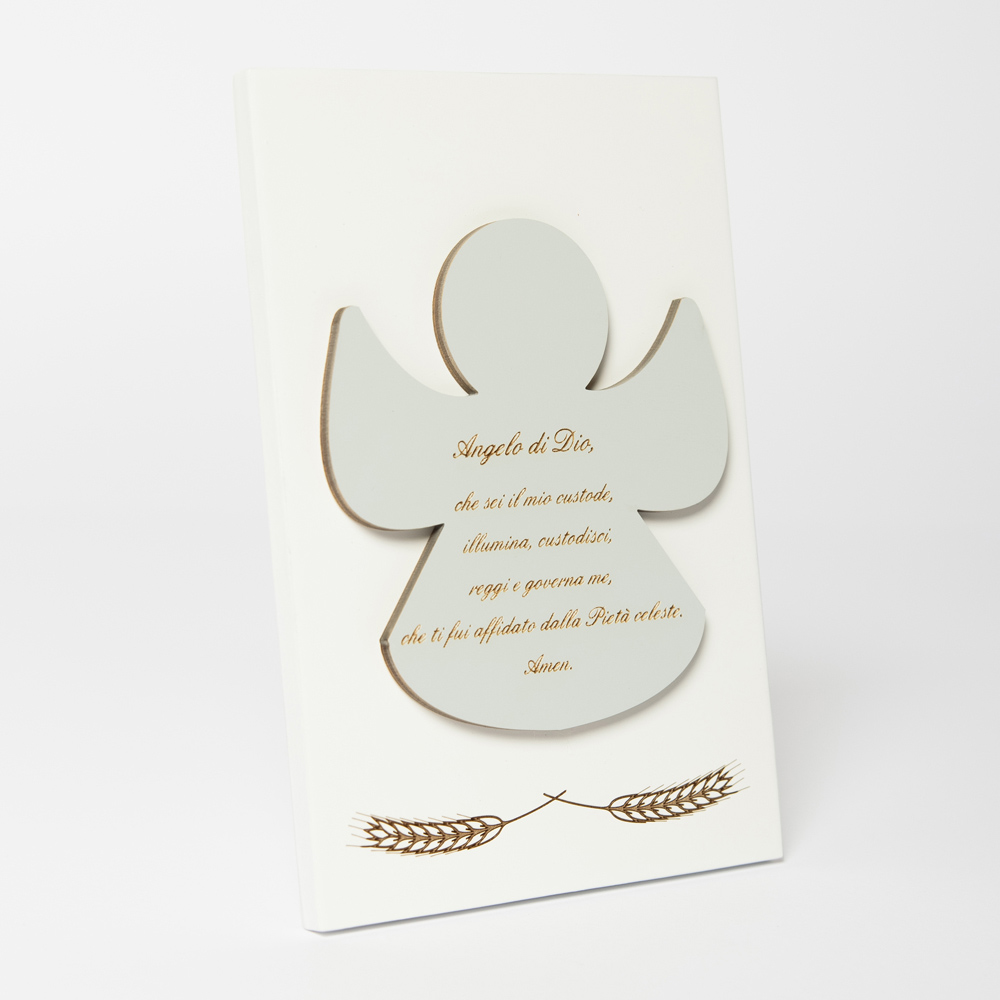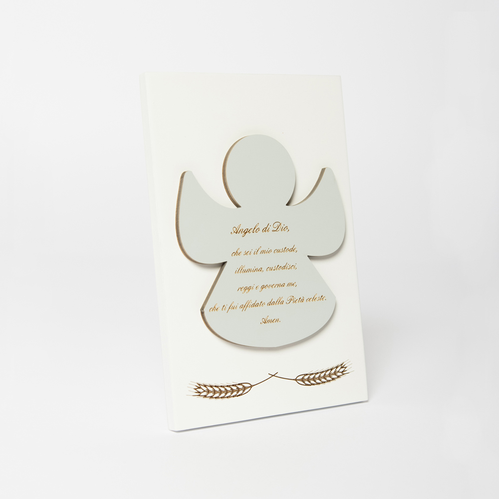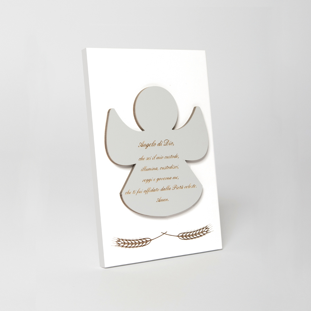 Heiligenbild mit Applikation eines Engels mit eingraviertem Gebet. Weiß lackierte Holzplatte mit Stützfuß. Anwendung in Staubgrau.