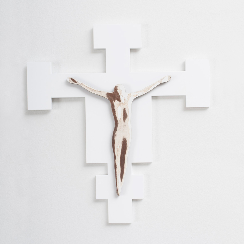 Kruzifix aus weiß lackiertem Holz mit lasergravierter Christusapplikation aus weiß lackiertem Holz , die die Details des Körpers hervorhebt.