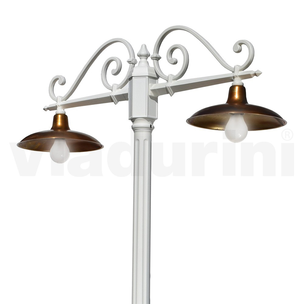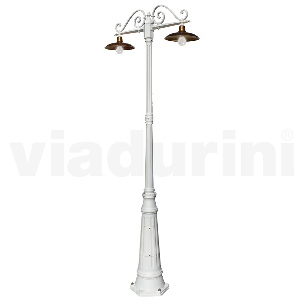 2-flammige Gartenlampe, komplett in Italien hergestellt, mit Struktur aus geprägtem weißem Aluminiumdruckguss und Diffusor aus natürlichem Messing (Durchmesser 260 mm). Komplett mit Edelstahlschrauben und Silikondichtung für besseren Schutz. Ein Einrichtungsaccessoire für Außenbereiche mit starker Vintage-Persönlichkeit und einem romantischen Stil, der sich durch wunderbare, raffinierte und sorgfältig ausgearbeitete Details auszeichnet, die seine Eleganz unterstreichen. Ideal für Außenbereiche wie Gärten, Alleen, Gehwege oder gewerbliche Außenbereiche wie Bars und Restaurants.
