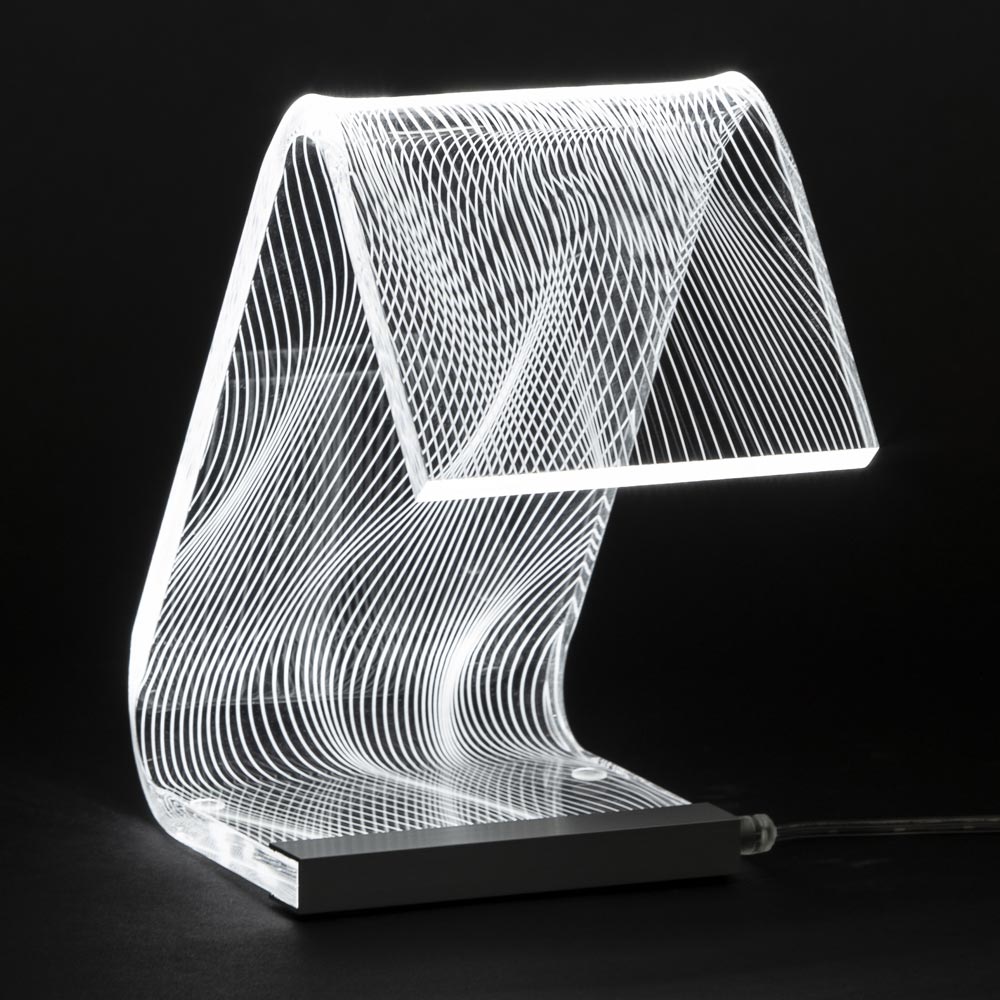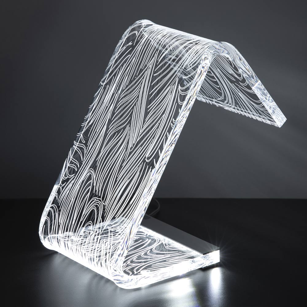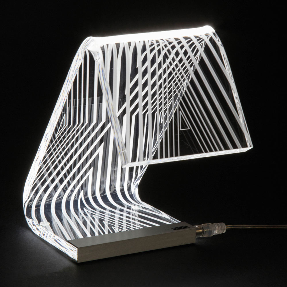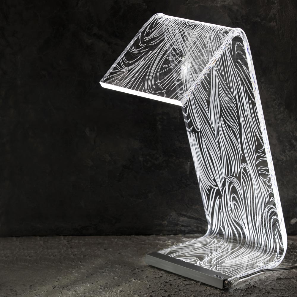 Diese Tischlampe   Es besteht vollständig aus transparentem und handgebogenem Acrylkristall mit einer Dicke von 10 mm und zeichnet sich durch Lasergravuren auf der Oberfläche aus, die durch einen an der Basis angebrachten LED-Streifen über die gesamte Länge des Leuchtenkörpers leuchten und so Licht erzeugen Ein außergewöhnliches Wirkungsspiel, das durch die physikalisch-technischen Eigenschaften des Acrylkristalls ermöglicht wird.