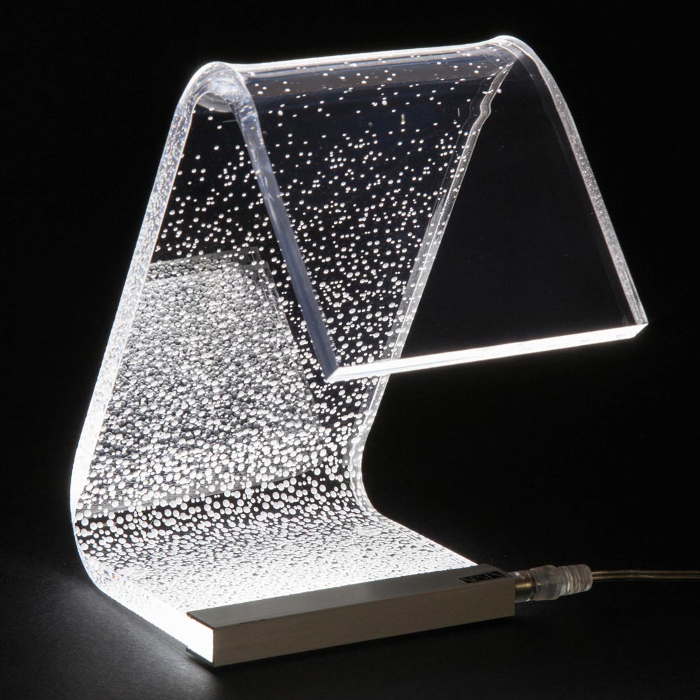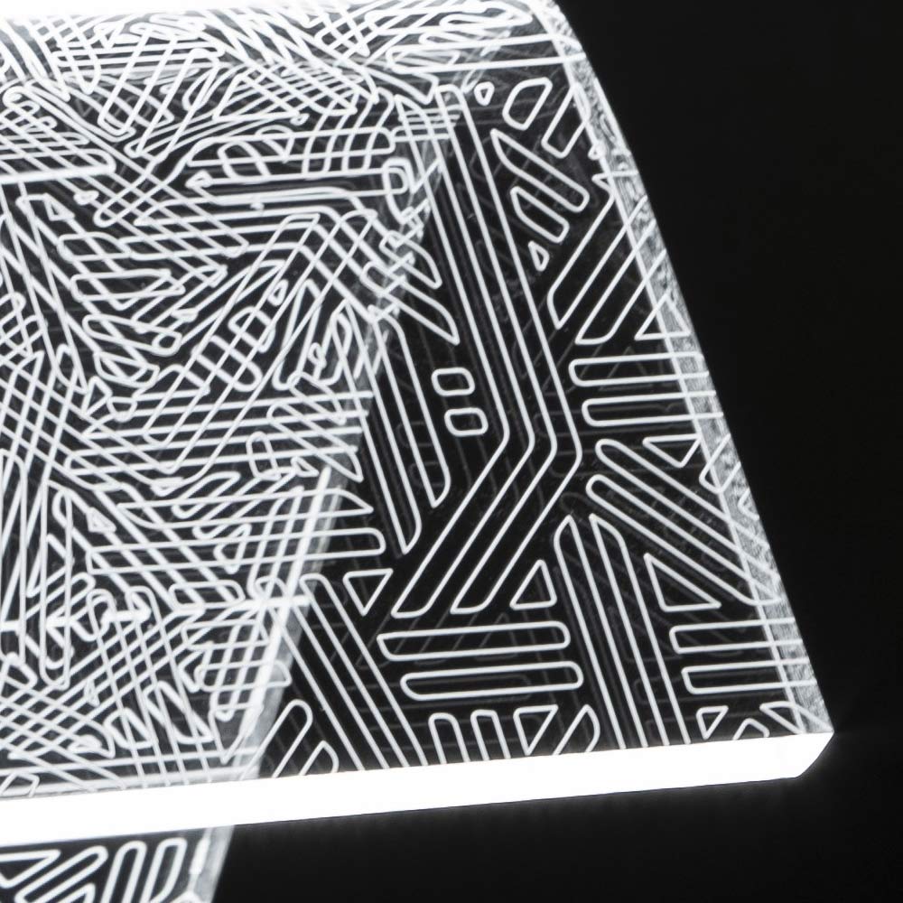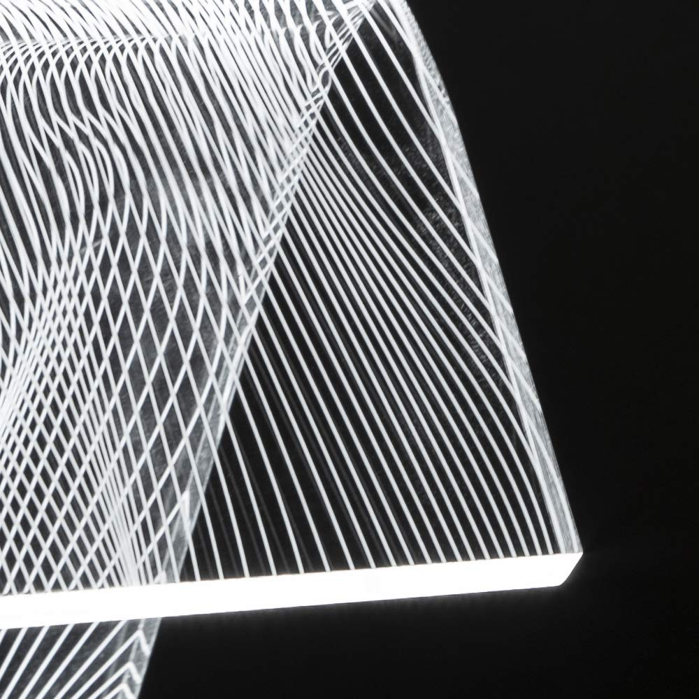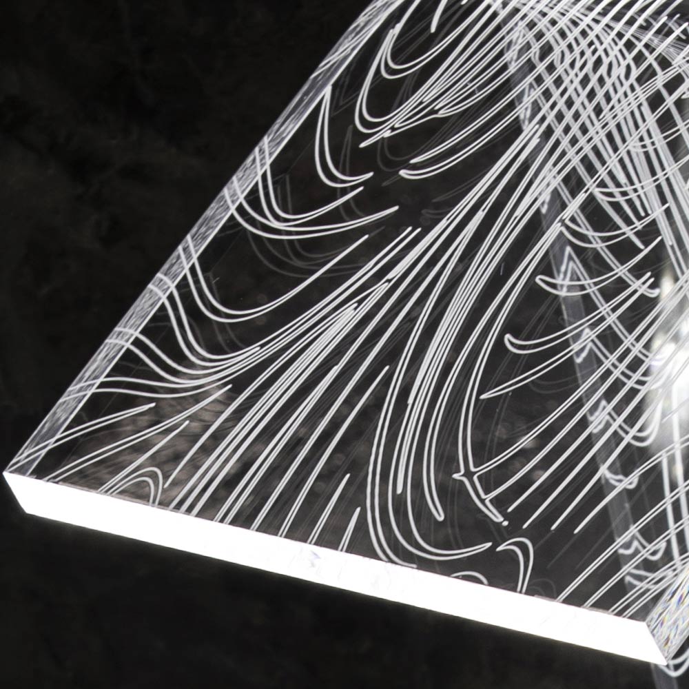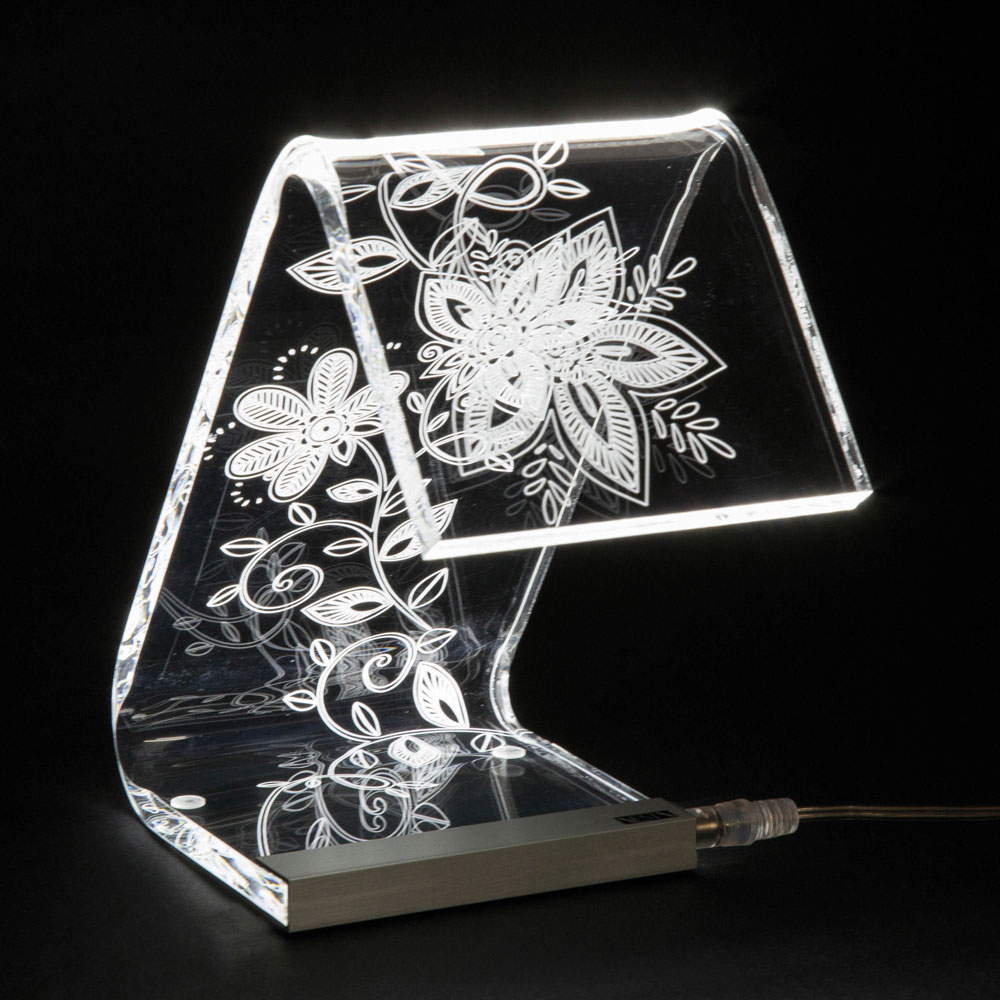 Diese Tischlampe   Es besteht vollständig aus transparentem und handgebogenem Acrylkristall mit einer Dicke von 10 mm und zeichnet sich durch Lasergravuren auf der Oberfläche aus, die durch einen an der Basis angebrachten LED-Streifen über die gesamte Länge des Leuchtenkörpers leuchten und so Licht erzeugen Ein außergewöhnliches Wirkungsspiel, das durch die physikalisch-technischen Eigenschaften des Acrylkristalls ermöglicht wird.