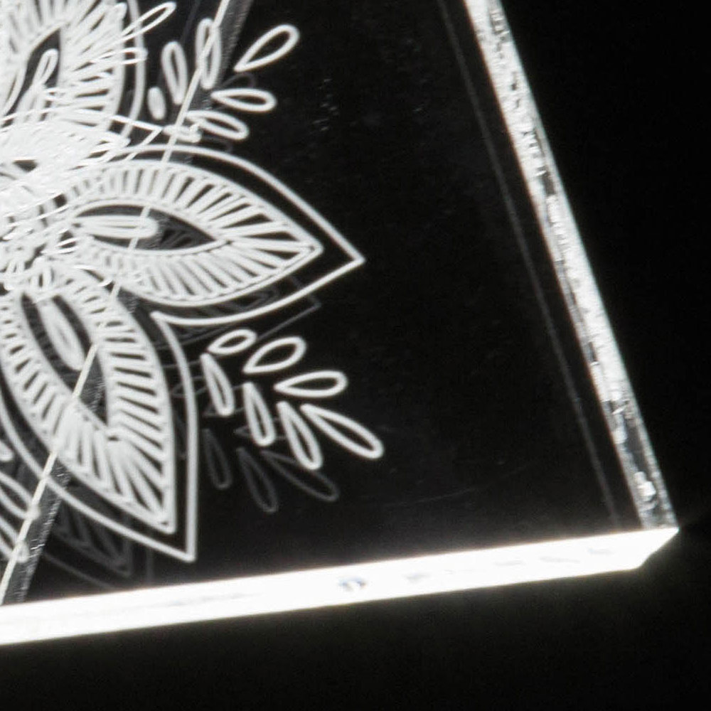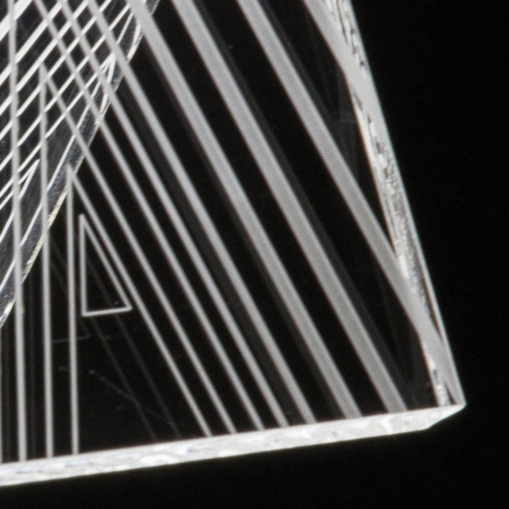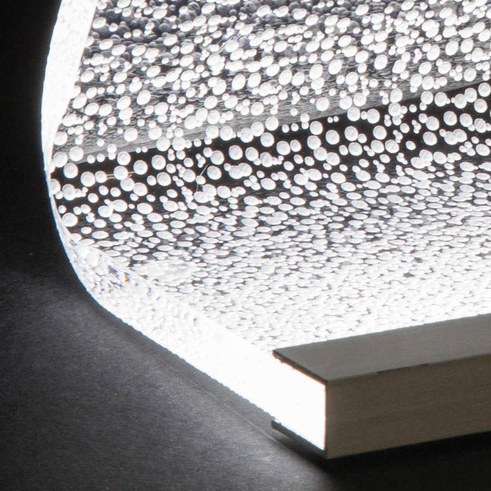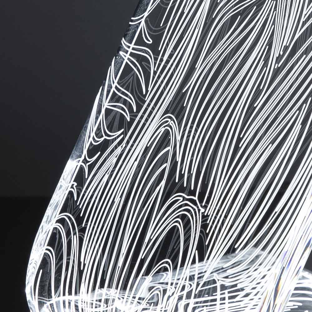Diese Tischlampe   Es besteht vollständig aus transparentem und handgebogenem Acrylkristall mit einer Dicke von 10 mm und zeichnet sich durch Lasergravuren auf der Oberfläche aus, die durch einen an der Basis angebrachten LED-Streifen über die gesamte Länge des Leuchtenkörpers leuchten und so Licht erzeugen Ein außergewöhnliches Wirkungsspiel, das durch die physikalisch-technischen Eigenschaften des Acrylkristalls ermöglicht wird.