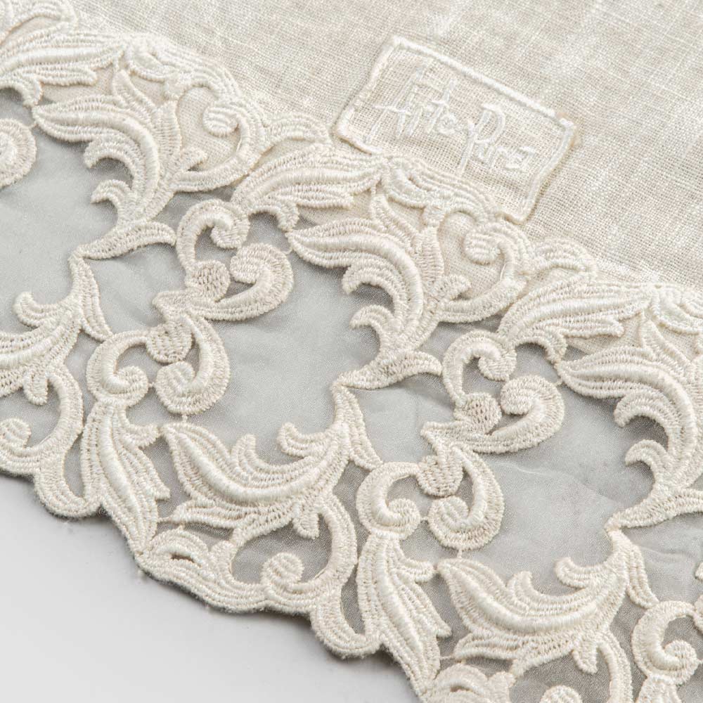 Der Wert der Tradition verbindet den modernen Lebensstil mit diesem Tischläufer in zwei Ausführungen aus schwerem Leinen mit gefalteten Kanten und einem Farnese- Spitzengewebe.