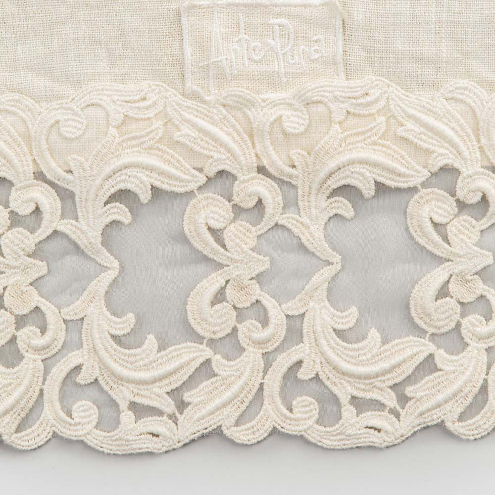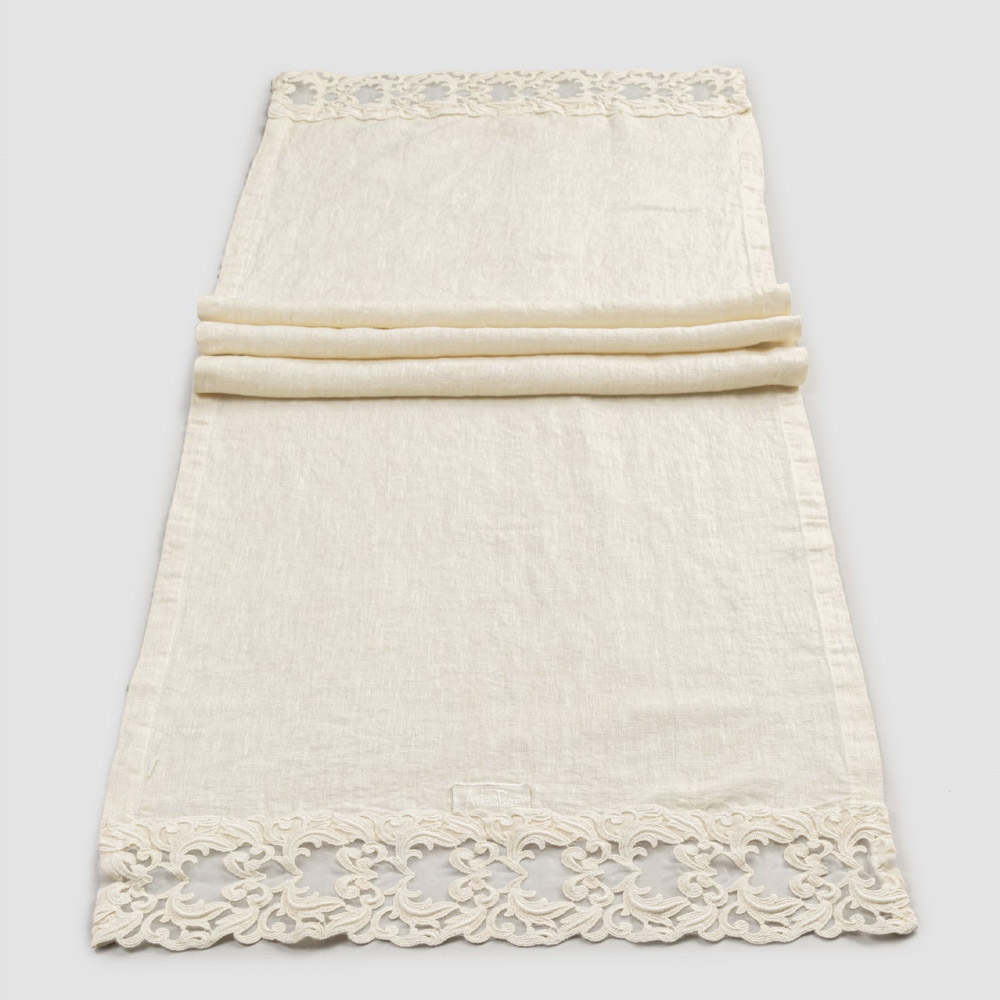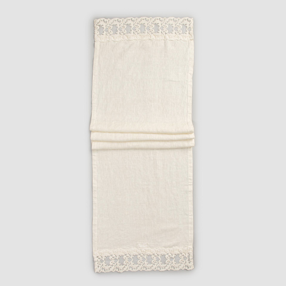 Schwerer Tischläufer aus Leinen mit Spitze und gefalteter Kante, Luxus made in Italy.