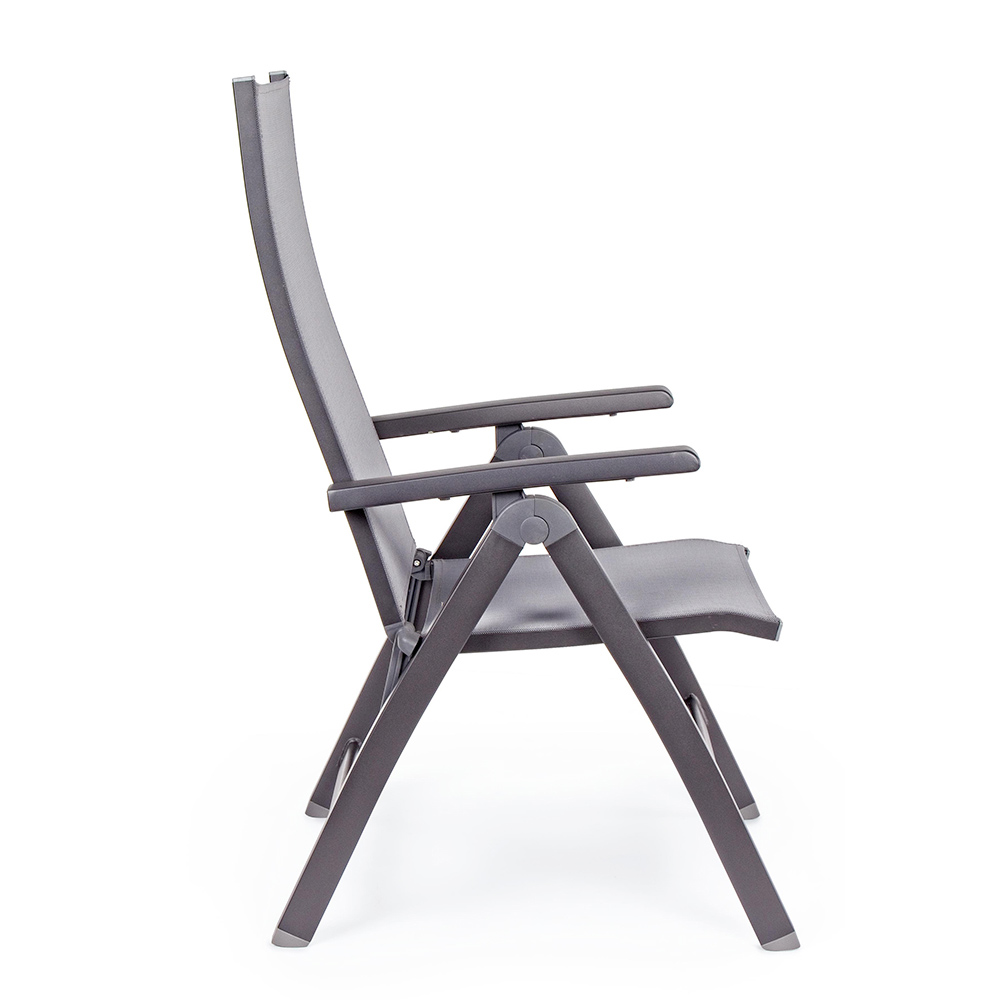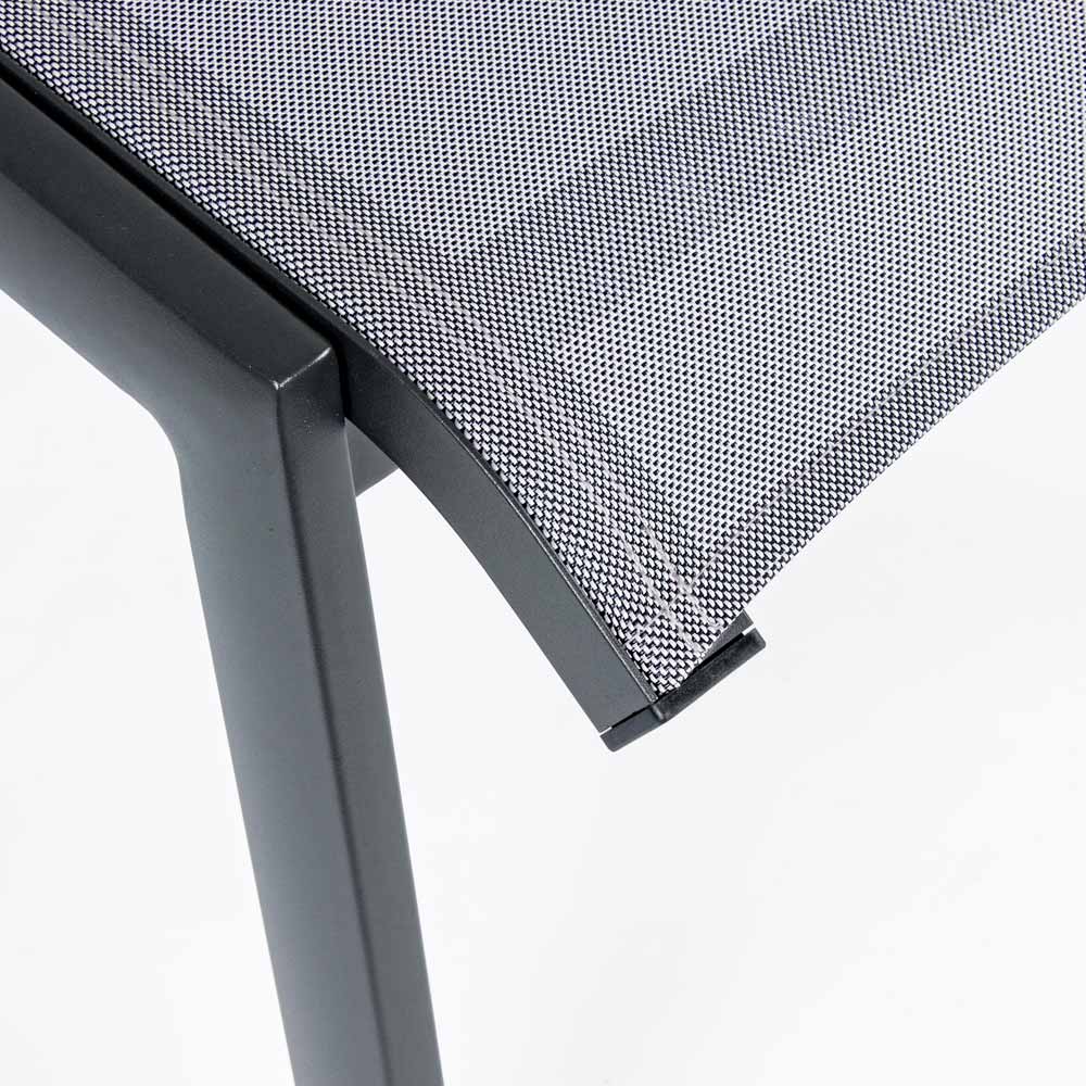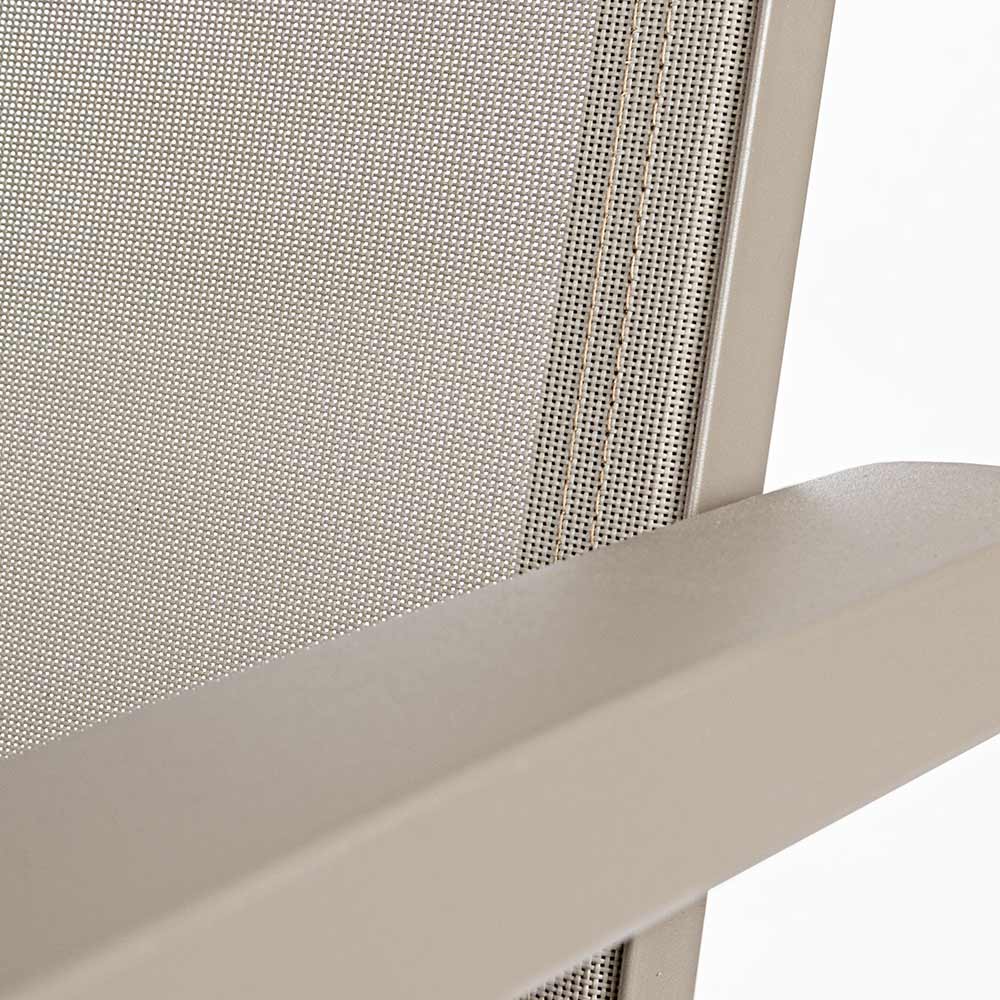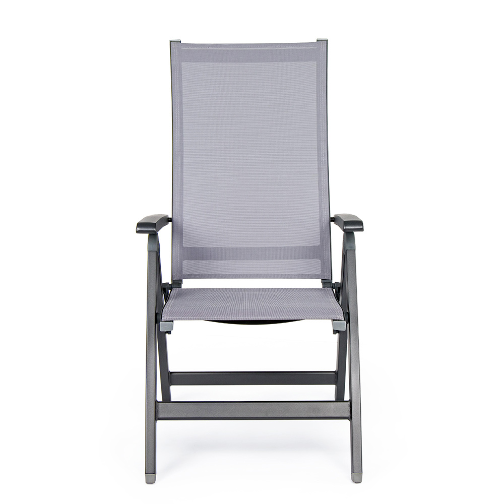 Pulverbeschichtete Aluminiumstruktur (Polyester). Sitz und Rückenlehne mit 1x1 Phifer Textilene bezogen. Rückenlehne (5 Positionen). Falten.