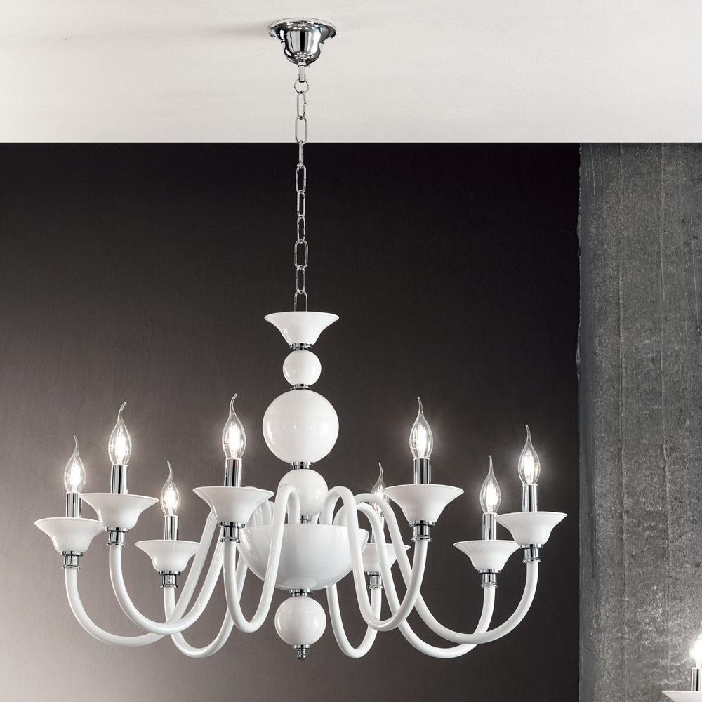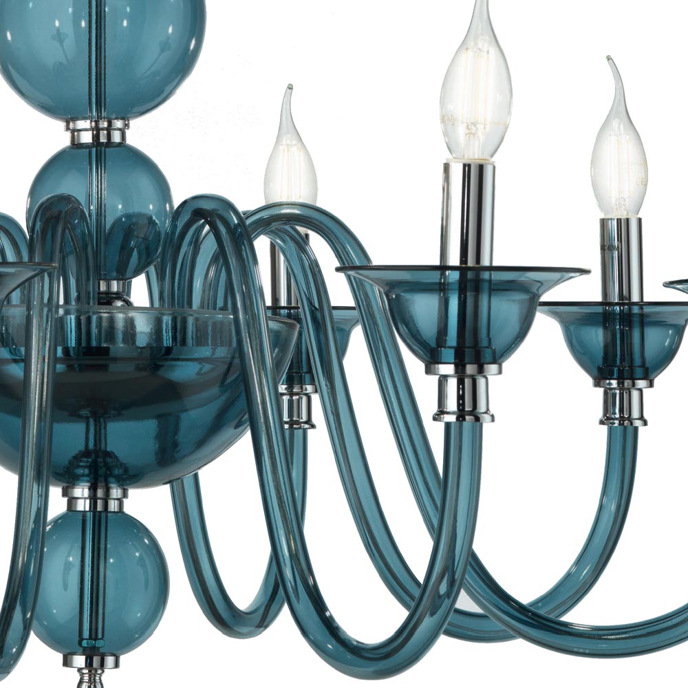 Ideal für alle, die eine szenografische Beleuchtung im Stil vergangener Zeiten wünschen. Ihr klassisches und luxuriöses Design besteht aus übereinander angeordneten Kugeln für den Leuchtenkörper, die einen Blick auf den verchromten Metallkern ermöglichen, und aus 8 gewölbten Armen , komplett aus handgefertigtem Glas gefertigt und in verschiedenen eleganten Farbtönen erhältlich, um sich perfekt an jeden Ort anzupassen und unterschiedliche Bedürfnisse zu befriedigen.