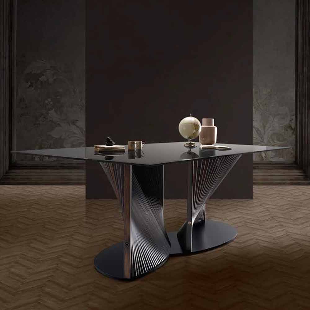 Eleganter Esstisch aus Rauchglas und Holz, hochwertig Made in Italy.