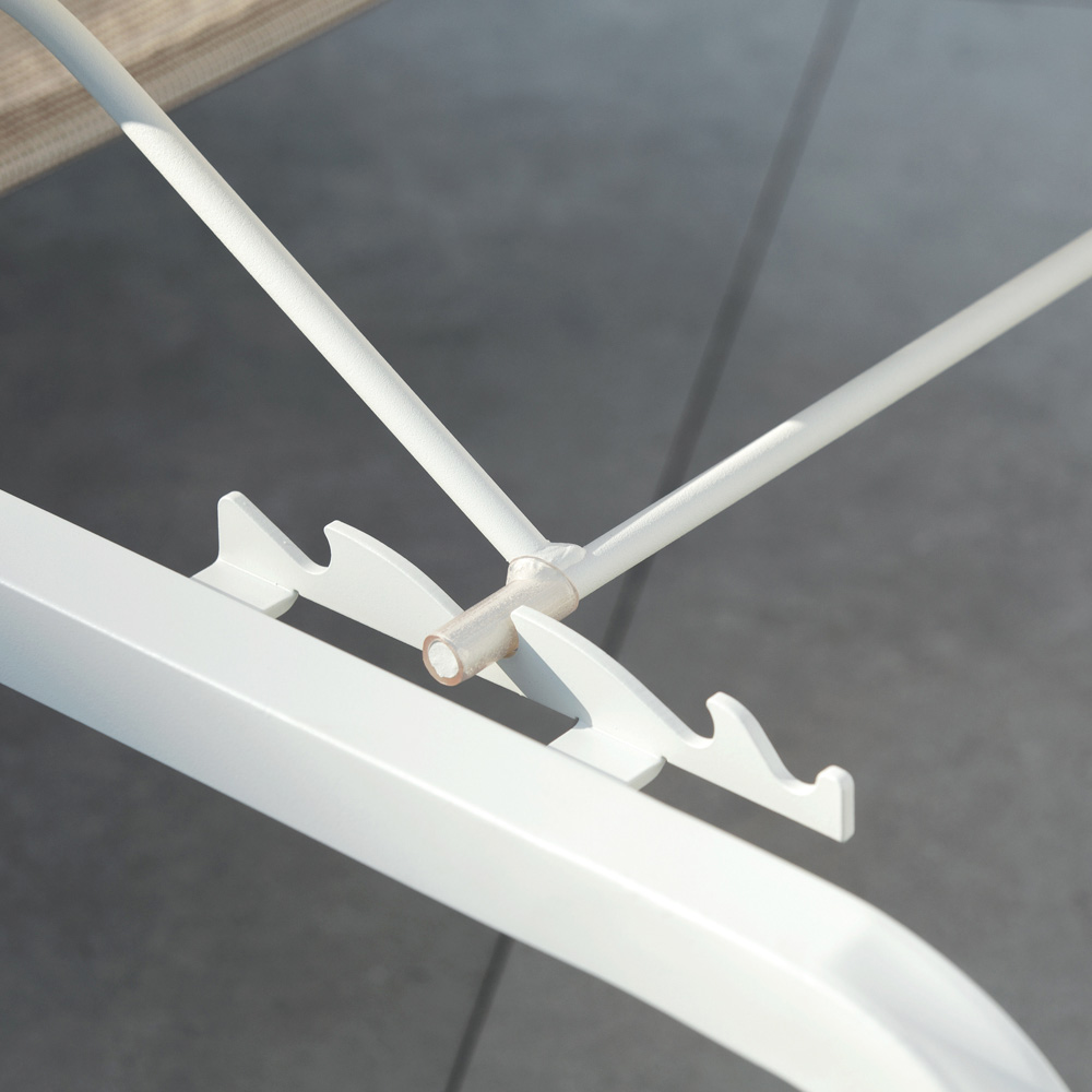 Pflege : Um eine möglichst lange Lebensdauer des Produkts zu gewährleisten, empfehlen wir, es im Winter im Innenbereich und an trockenen Orten zu lagern, um zu verhindern, dass Feuchtigkeit den Lack der Struktur beschädigt. Bei Standorten in Küstennähe empfehlen wir als zusätzliche Vorsichtsmaßnahme, die Oberflächen alle zwei bis drei Monate mit milden Reinigungsmitteln zu reinigen und anschließend mit ölhaltigen Produkten zu schützen. Wir empfehlen, den Kontakt des Sitzes mit fetthaltigen Substanzen oder Farbstoffen zu vermeiden, um zu verhindern, dass das Material diese aufnimmt und möglicherweise durch dauerhafte Flecken beschädigt wird. Verwenden Sie zur regelmäßigen Reinigung Wasser und nicht scheuernde, farblose und pH-neutrale Reinigungsmittel.
