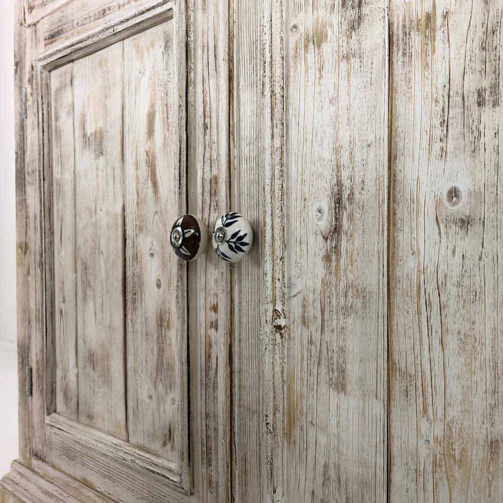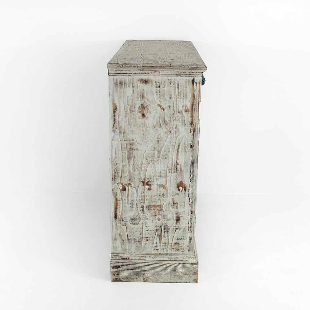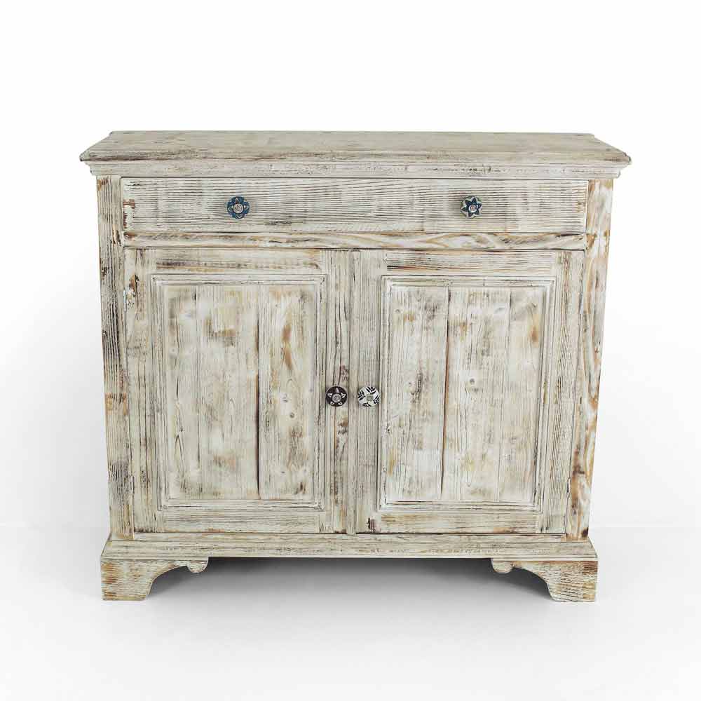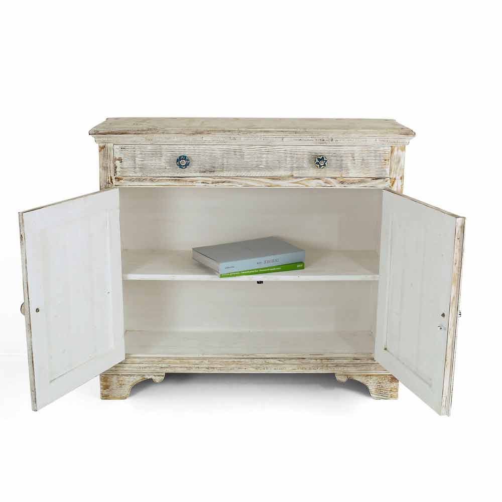 Sideboard aus massivem Tannenholz, vollständig handgefertigt in Italienund gekennzeichnet durch das wundervolle flammengebrannte, enthäutete Finish, das die besondere Maserung des Holzes hervorhebt, die das Produkt einzigartig macht. Das Sideboard wird dann mit einer gealterten weißen Farbe versehen und mit der transparenten Oberfläche versehen, die es wasserabweisend macht und die Farben so fixiert, dass sie im Laufe der Zeit unveränderlich sind. Die Struktur umfasst 2 Türen mit internem Regal und 1 Schublade mit Pappelsperrholzboden, die mit speziellen handbemalten Keramikknöpfen versehen sind, die Ihnen perfekt organisierte Räume ermöglichen.