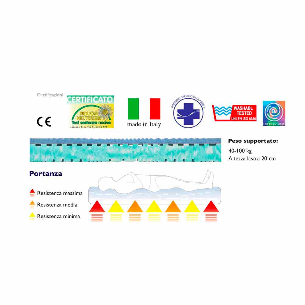Die Bio Natura-Matratze verwendet eines der innovativsten und technologischsten Produkte, nicht nur in Bezug auf das Produkt, sondern auch beim Aufbau der fertigen Matratze. Tatsächlich besteht der obere Teil aus einer luftempfindlichen Memory- Schicht, die mit Massagewellen unterschiedlicher Breite geformt ist, um die Wirkung der 7 Zonen zu erzielen, und dank ihrer besonderen Struktur schafft sie es, die gesamte überschüssige Körperwärme durch die zahlreichen Poren abzuleiten woraus es besteht. Die beste Transpiration wird auch durch das besondere Profil und die Löcher garantiert, die das Memory an die "Natura" -Schaumstoffschicht binden, die das Körpergewicht korrekt und effektiv trägt und auch im unteren Teil geformt ist, um die Verwendung dieses Produkts auf mechanisierten Netzen zu erleichtern . Da das luftempfindliche Memory-Teil nicht geklebt wird, ist es vollständig abnehmbar und waschbar , ein Vorgang, der bei herkömmlichen und ungetesteten Produkten nicht durchgeführt werden kann. Aus diesem Grund empfehlen wir die Verwendung dieser als Medizinprodukt der Klasse I zertifizierten Matratze in Kombination mit einem speziell entwickelten Bezug mit integriertem Toppergehäuse. Unterstütztes Gewicht 60/120 kg pro Person Futter mit atmungsaktivem 3D-Band . Alle Bezüge sind aus elastischem Stoff gefertigt, der durch seine perfekte Haftung ideal für alle ist, die Wert auf Qualität und Qualität legen Eigenschaften Ihrer Matratze. Dank der rechteckigen oder unterschiedlich welligen Steppung haben die Bezüge eine weiche und flauschige Konsistenz, mit der Fähigkeit, ihre luftig-leichte Form nach dem Komprimieren leicht wieder anzunehmen. Tatsächlich können sie dank ihrer natürlichen Elastizität ohne spezielle Behandlungen gewaschen und getrocknet werden. Das Ergebnis ist ein perfekt hygienisches , milbenhemmendes und langlebiges Produkt, das seine Eigenschaften im Laufe der Zeit unverändert behält. Um eine hohe Atmungsaktivität zu erreichen, sind die Bezüge mit einem 3D-Band ausgestattet, das eine bessere Luftzirkulation garantiert perfektes Mikroklima in der Matratze.