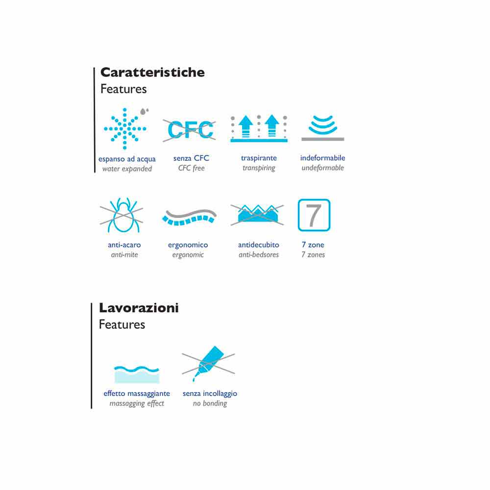 Die beste Atmungsaktivität wird auch durch das besondere Profil und von den Löchern, die an der Schicht aus Memory-Schaum "Nature", die in einer korrekten und wirksamen Körpergewicht unterstützt binden garantiert, das auch an der Unterseite geformt ist, um die Verwendung des Produkts über Netze erleichtern mechanisiert.