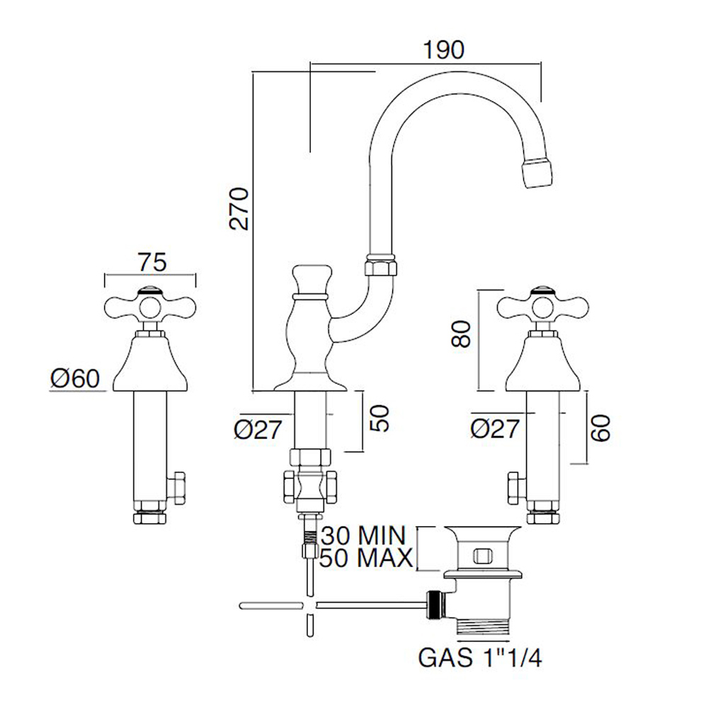 Waschtischarmatur ein 3-Loch mit hohem Auslauf und Abfluss è vollständig