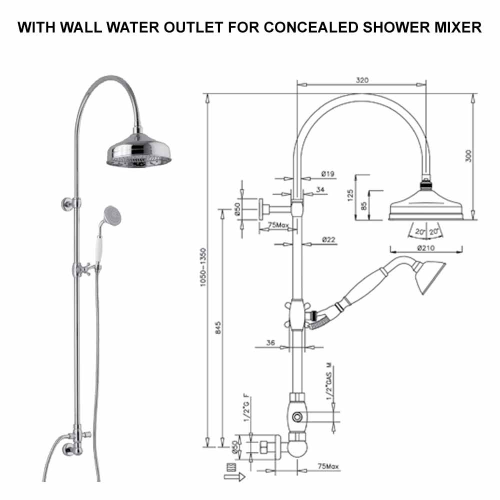 Duschsäule aus Messing mit rundem Duschkopf und antiker Handbrause. Hergestellt in Italien.