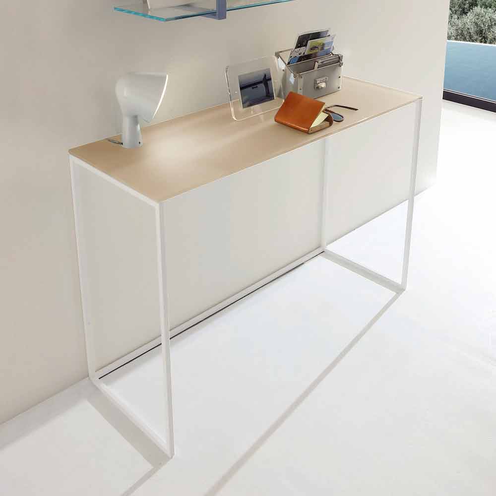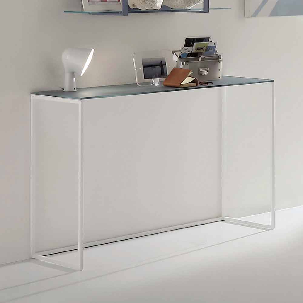 Moderne Konsole made in Italy mit Glasplatte und weiß lackierter Metallstruktur . Eine einfache und vielseitige Einrichtungslösung, die jeden Raum charakterisieren kann, indem sie der Umgebung einen Hauch von Stil verleiht. Seine wesentlichen Linien ermöglichen es ihm, die Rolle einer praktischen Stützfläche in verschiedenen Bereichen des Hauses wie dem Eingang oder dem Wohnzimmer zu spielen, und beweisen gleichzeitig ein perfektes dekoratives Element, das die Möbel vervollständigen kann. Dank der Wahl, dass Sie die unbestrittene Modernität des Metalls mit der zeitlosen Eleganz des Kristalls und seinen wunderbaren Oberflächen kombinieren, bietet das Endergebnis eine innovative und originelle Idee, die jeden Raum einzigartig machen kann, wenn auch in seiner extremen Einfachheit.