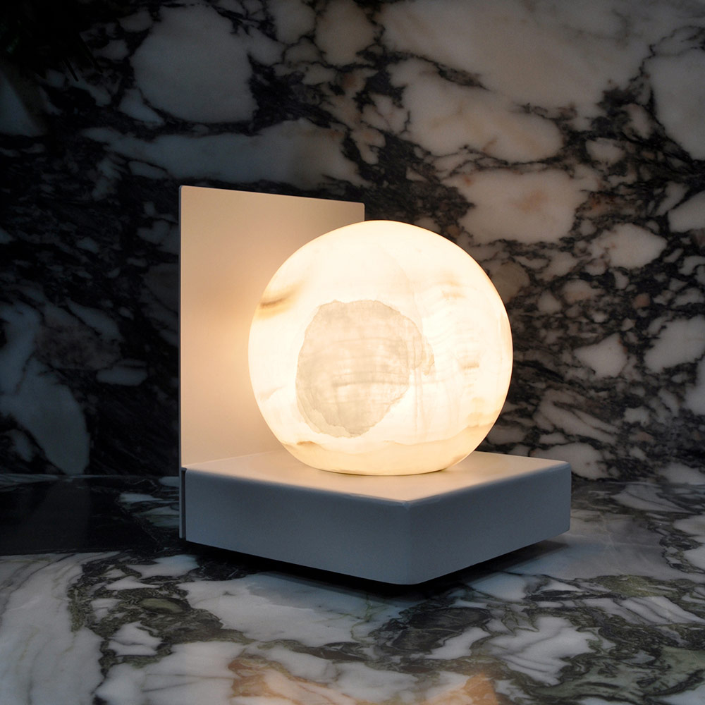 Der solide und elegante Sockel kontrastiert schön mit der Weichheit der Lichtkugel und schafft ein Designerstück, das sowohl modern als auch zeitlos ist. Jede Lampe ist einzigartig, nicht nur in ihrer Form, sondern auch in den Schattierungen und Designs, die die Natur in den Marmor geprägt hat, was sie zu einer leuchtenden Skulptur macht, die mit ihrer Präsenz die Umgebung erwärmt.