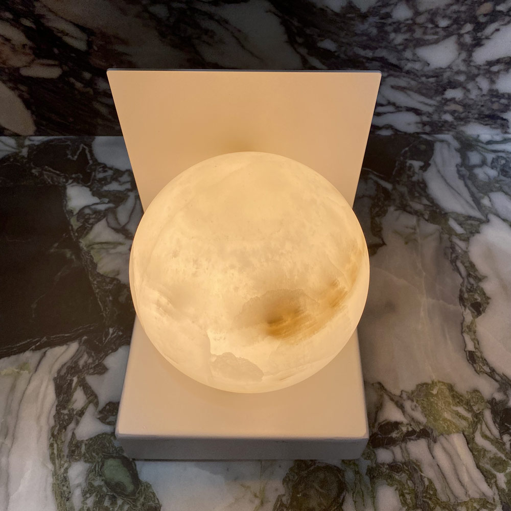 Diese Kugellampe aus Marmor ist ein Statement von Stil und Wärme, perfekt für alle, die jeder Umgebung eine intime und einladende Atmosphäre verleihen möchten. Die Kugelform aus durchscheinendem Marmor strahlt ein weiches und diffuses Licht aus und projiziert die zarten Muster seiner natürlichen Adern an die Wände.