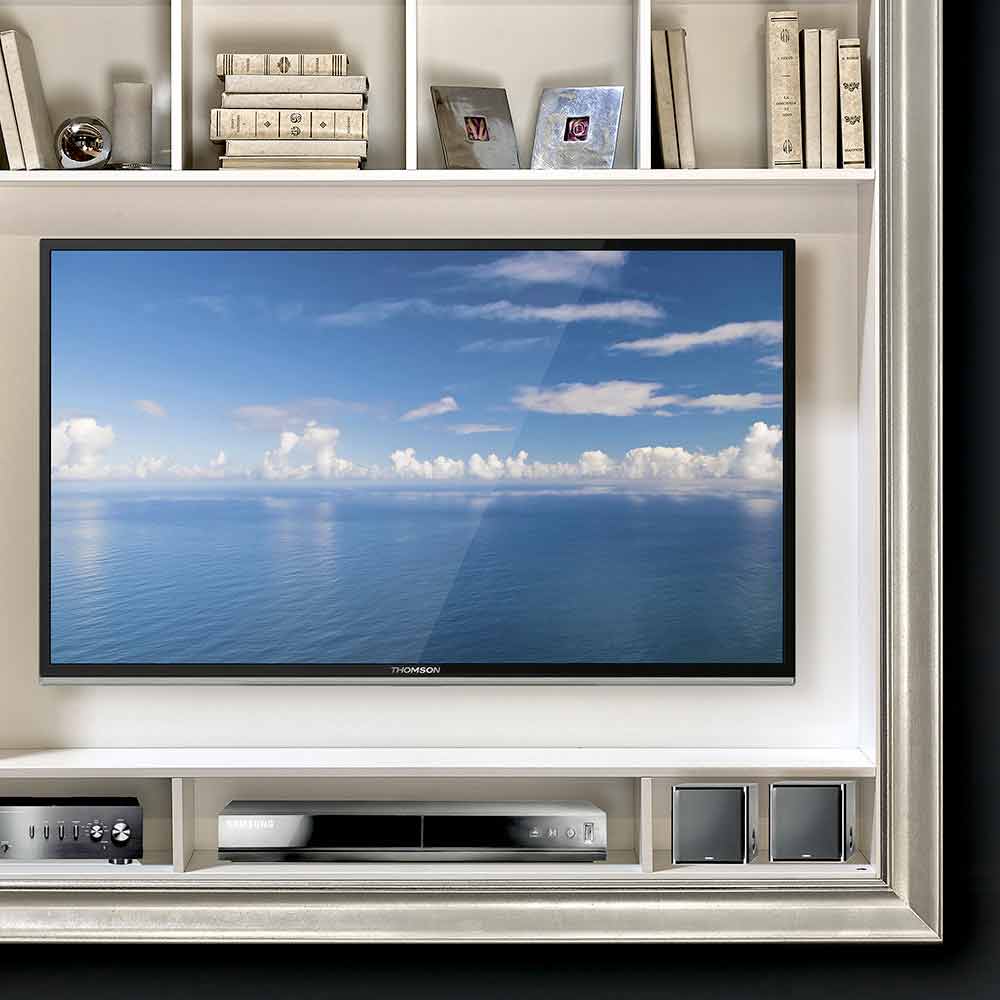 Im Inneren des Rahmens befindet sich in der Mitte ein Fernsehfach, das von eleganten Regalen flankiert wird, die Platz für Bücher und Dekorationsgegenstände bieten, um den Raum zu personalisieren und zu bereichern. Darunter sind diskrete Fächer untergebracht, die Multimedia-Geräte stilvoll unterbringen und so für Ordnung und ohne freiliegende Kabel sorgen.
