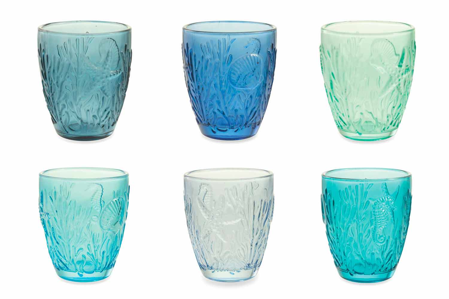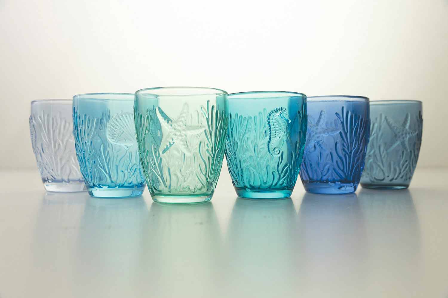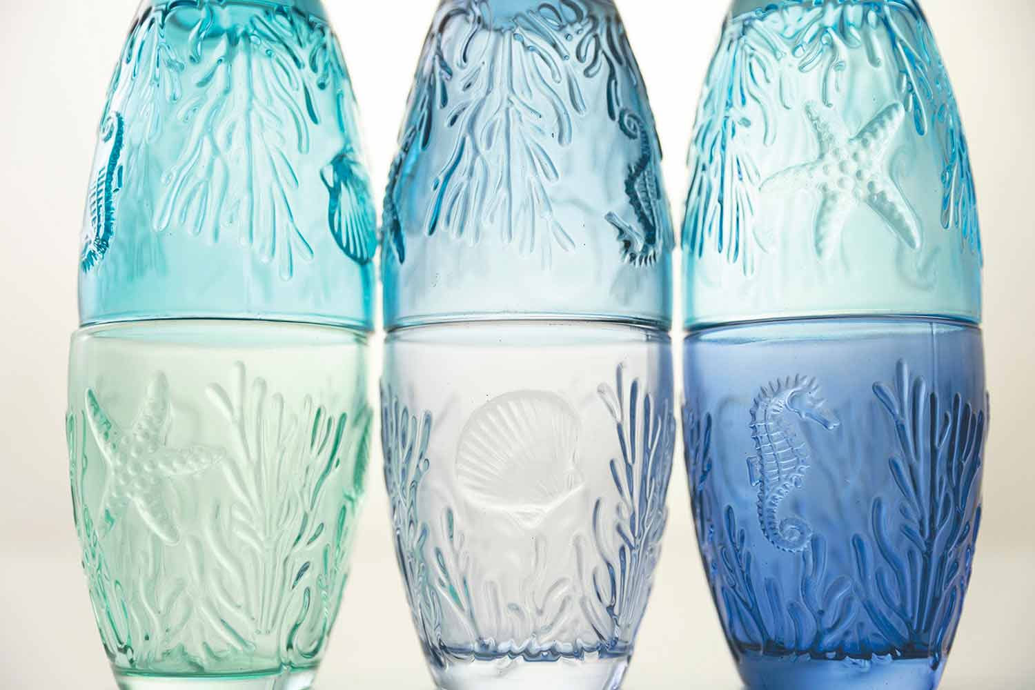 Es ist ein Service von Gläsern, der nicht nur vom Meer inspiriert ist, sondern es in seiner Gesamtheit zurücknimmt und auf der Außenfläche des Glases seine einfache und nicht kontaminierte Schönheit rekonstruiert: Seesterne, Muscheln, Algen und Korallen werden fein geschnitzt, um einen Juweleneffekt zu erzielen fein und raffiniert. Ein zeitloser Charme, der die Gäste mit seinen frischen Schattierungen von Blau bis Grün verzaubern kann , die zu den Protagonisten des Tisches werden und eine entspannende und marine Atmosphäre in der Umgebung verbreiten. Das Material spielt eine entscheidende Rolle: Die Transparenz des Glases wird mit dem Konzept des kristallklaren Wassers des Meeres kombiniert.