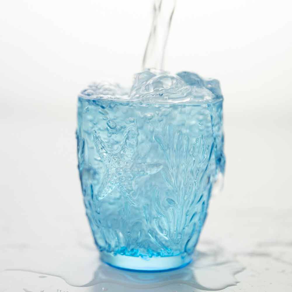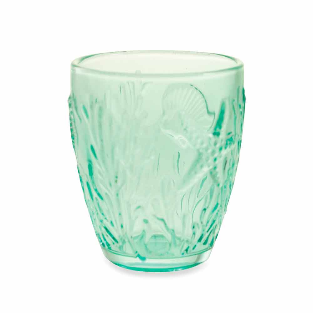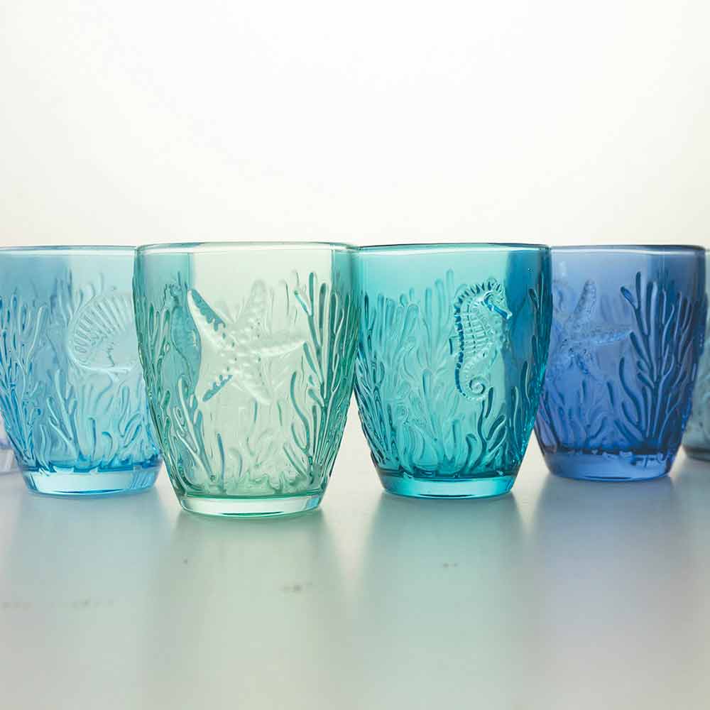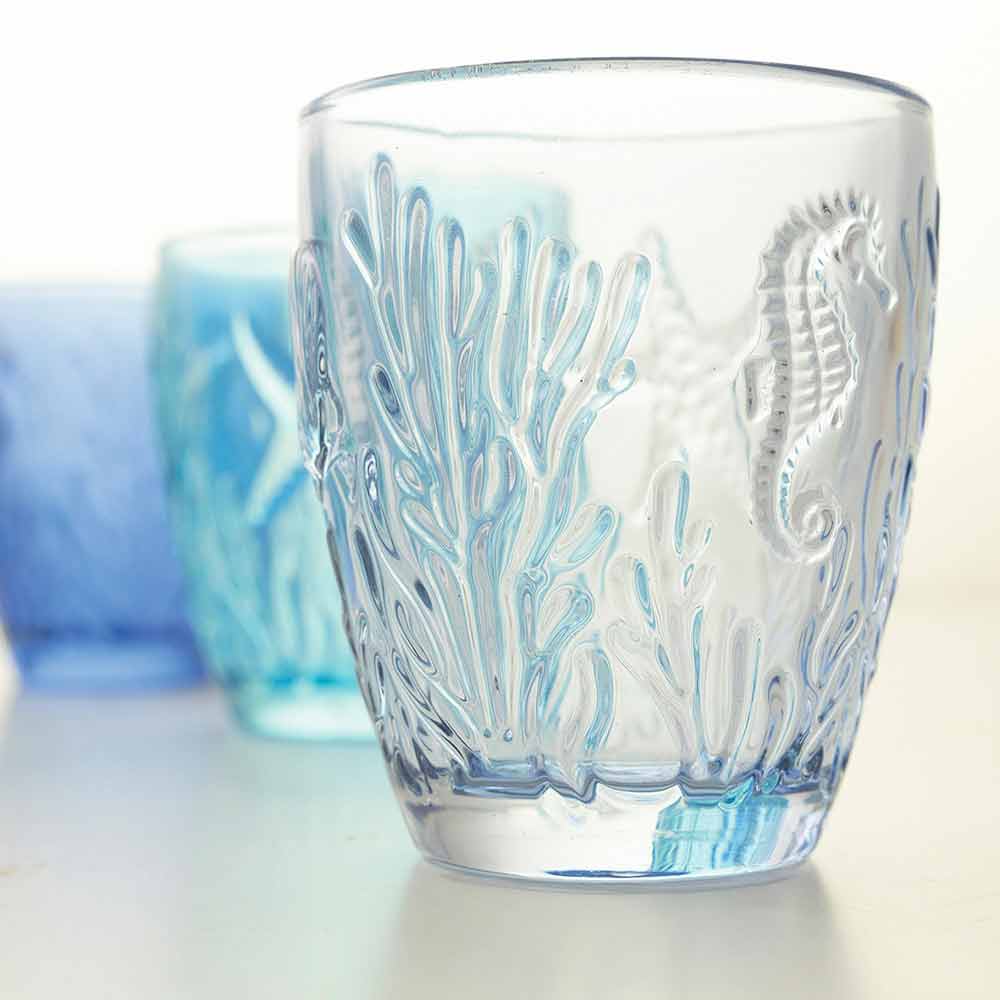 Es ist ein Service von Gläsern, der nicht nur vom Meer inspiriert ist, sondern es in seiner Gesamtheit zurücknimmt und auf der Außenfläche des Glases seine einfache und nicht kontaminierte Schönheit rekonstruiert: Seesterne, Muscheln, Algen und Korallen werden fein geschnitzt, um einen Juweleneffekt zu erzielen fein und raffiniert. Ein zeitloser Charme, der die Gäste mit seinen frischen Schattierungen von Blau bis Grün verzaubern kann , die zu den Protagonisten des Tisches werden und eine entspannende und marine Atmosphäre in der Umgebung verbreiten. Das Material spielt eine entscheidende Rolle: Die Transparenz des Glases wird mit dem Konzept des kristallklaren Wassers des Meeres kombiniert.